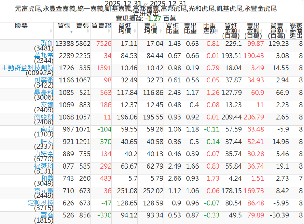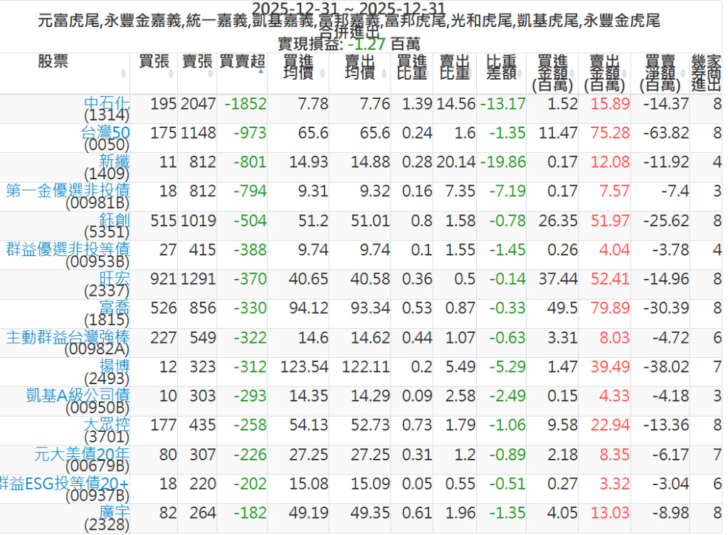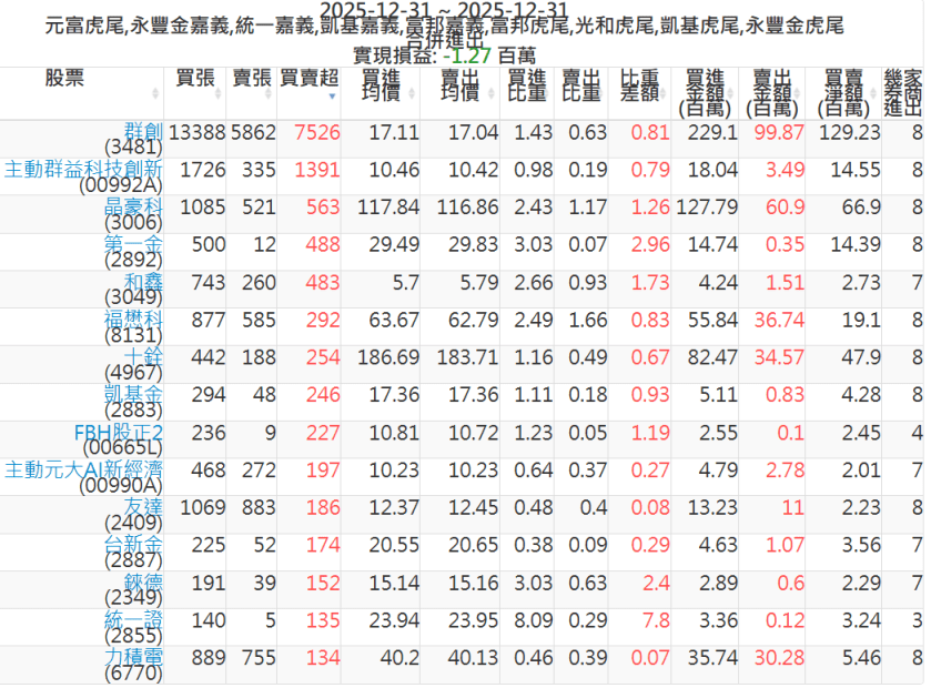 2025-1231主力買賣超個股 2025-12-31 股狗網小編 籌碼面每日資訊 發表留言 可參考下文 『如何查詢當沖、隔日沖分公司券商買賣』 主力當沖券商: 『元富虎尾』,『永豐金嘉義』,『統一嘉義』,『凱基嘉義』,『富邦嘉義』,『富邦虎尾』,『光和虎尾』,『凱基虎尾』,『永豐金虎尾』。 『當沖標的』 『買超股票』 『賣超股票』 免責宣言 本網站文章所提供資訊僅供參考,並無任何推介買賣之意,投資人應自行承擔交易風險。 分享此文: 按一下即可分享至 X(在新視窗中開啟) X 按一下以分享至 Facebook(在新視窗中開啟) Facebook 喜歡 正在載入...