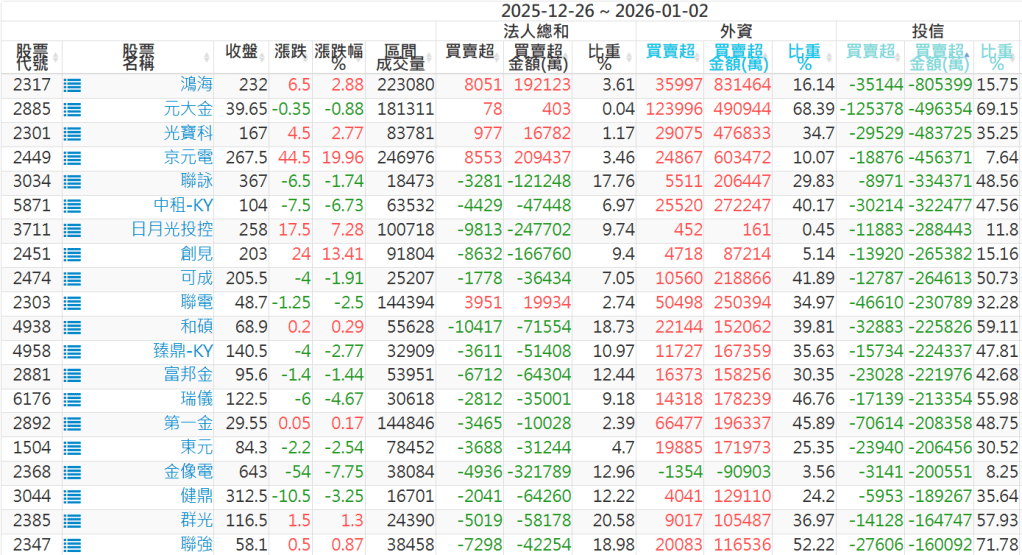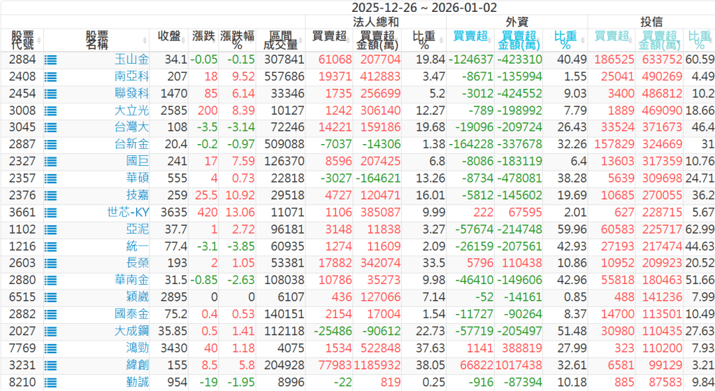 2025/12/26~2026/01/02近5日【投信】買賣超個股 2026-01-04 股狗網小編 投資誌-大盤 發表留言 【上市投信買超個股】(以金額排行,單位:萬) 【上市投信賣超個股】(以金額排行,單位:萬) 【上櫃投信買超個股】(以金額排行,單位:萬) 【上櫃投信賣超個股】(以金額排行,單位:萬) 免責宣言 本網站文章所提供資訊僅供參考,並無任何推介買賣之意,投資人應自行承擔交易風險。 分享此文: 按一下即可分享至 X(在新視窗中開啟) X 按一下以分享至 Facebook(在新視窗中開啟) Facebook 喜歡 正在載入...