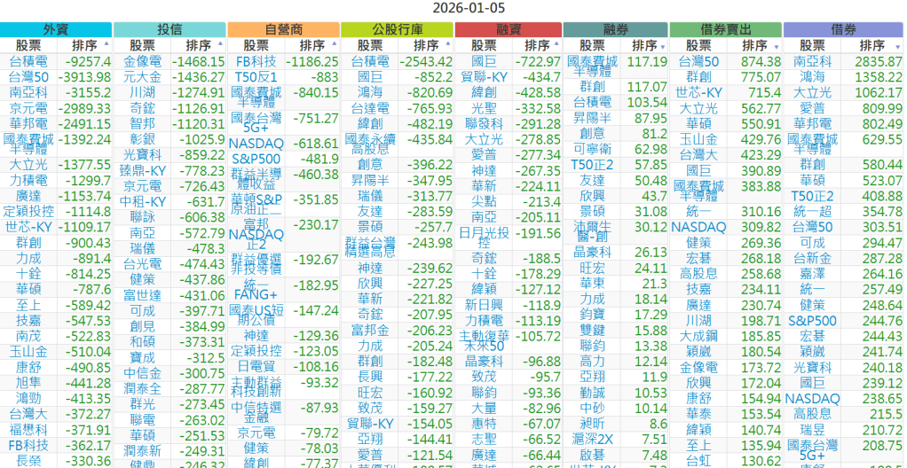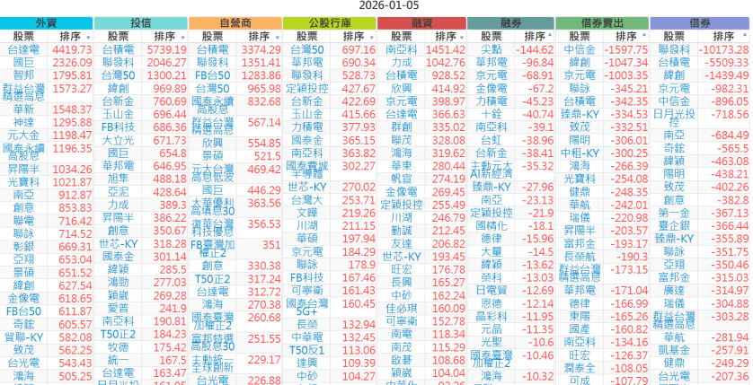 2026-0105【外資、投信】買賣超個股 2026-01-05 股狗網小編 投資誌-大盤 發表留言 上市:【外資、投信】買超(依金額) (單位:百萬) 上市:【外資、投信】賣超(依金額) (單位:百萬) 上市:【外資、投信】買超(依張數) (單位:張數) 上市:【外資、投信】賣超(依張數) (單位:張數) 免責宣言 本網站文章所提供資訊僅供參考,並無任何推介買賣之意,投資人應自行承擔交易風險。 分享此文: 按一下即可分享至 X(在新視窗中開啟) X 按一下以分享至 Facebook(在新視窗中開啟) Facebook 喜歡 正在載入...