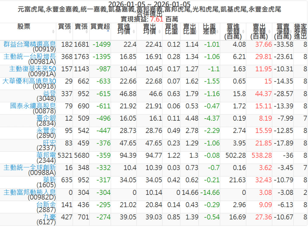2026-0105主力買賣超個股 2026-01-05 股狗網小編 籌碼面每日資訊 發表留言 可參考下文 『如何查詢當沖、隔日沖分公司券商買賣』 主力當沖券商: 『元富虎尾』,『永豐金嘉義』,『統一嘉義』,『凱基嘉義』,『富邦嘉義』,『富邦虎尾』,『光和虎尾』,『凱基虎尾』,『永豐金虎尾』。 『當沖標的』 『買超股票』 『賣超股票』 免責宣言 本網站文章所提供資訊僅供參考,並無任何推介買賣之意,投資人應自行承擔交易風險。 分享此文: 按一下即可分享至 X(在新視窗中開啟) X 按一下以分享至 Facebook(在新視窗中開啟) Facebook 喜歡 正在載入...