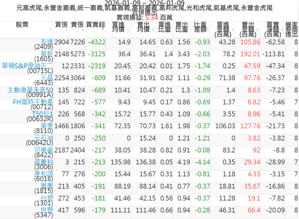 2026-0109主力買賣超個股 2026-01-09 股狗網小編 籌碼面每日資訊 發表留言 可參考下文 『如何查詢當沖、隔日沖分公司券商買賣』 主力當沖券商: 『元富虎尾』,『永豐金嘉義』,『統一嘉義』,『凱基嘉義』,『富邦嘉義』,『富邦虎尾』,『光和虎尾』,『凱基虎尾』,『永豐金虎尾』。 『當沖標的』 『買超股票』 『賣超股票』 免責宣言 本網站文章所提供資訊僅供參考,並無任何推介買賣之意,投資人應自行承擔交易風險。 分享此文: 按一下即可分享至 X(在新視窗中開啟) X 按一下以分享至 Facebook(在新視窗中開啟) Facebook 喜歡 正在載入...