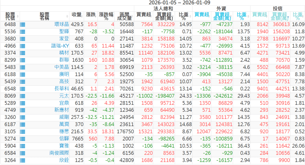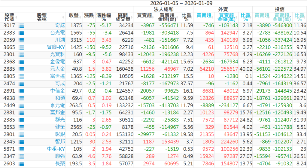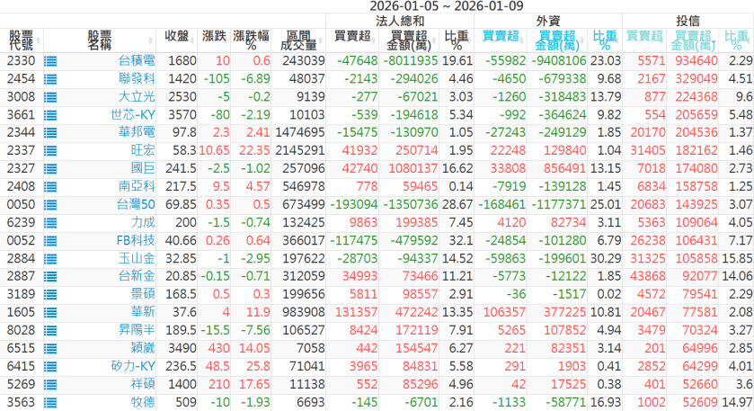 2026/01/05~2026/01/09近5日【投信】買賣超個股 2026-01-11 股狗網小編 投資誌-大盤 發表留言 【上市投信買超個股】(以金額排行,單位:萬) 【上市投信賣超個股】(以金額排行,單位:萬) 【上櫃投信買超個股】(以金額排行,單位:萬) 【上櫃投信賣超個股】(以金額排行,單位:萬) 免責宣言 本網站文章所提供資訊僅供參考,並無任何推介買賣之意,投資人應自行承擔交易風險。 分享此文: 按一下即可分享至 X(在新視窗中開啟) X 按一下以分享至 Facebook(在新視窗中開啟) Facebook 喜歡 正在載入...