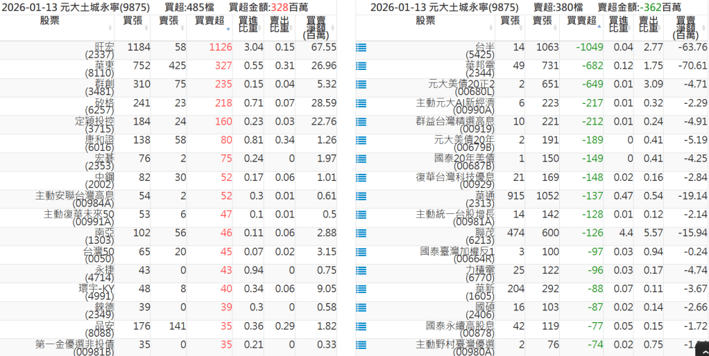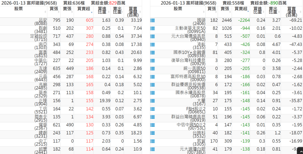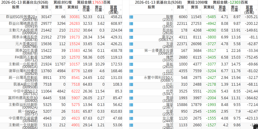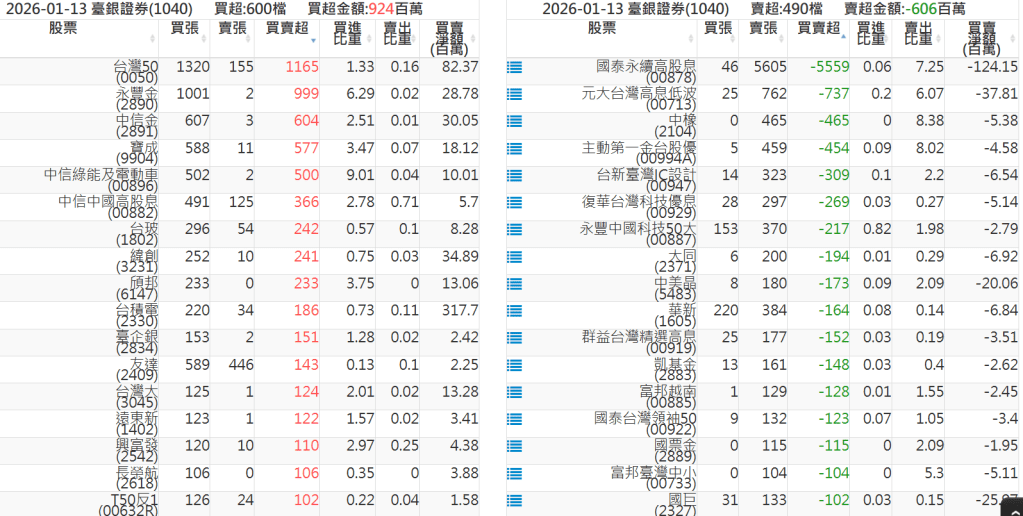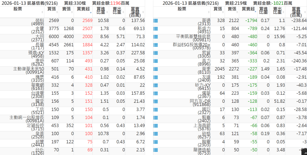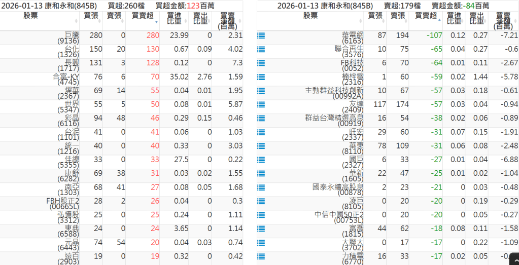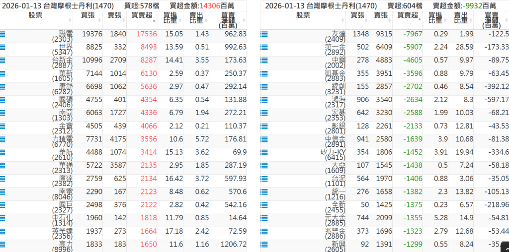 2026-0113關鍵券商買賣超 2026-01-13 股狗網小編 籌碼面每日資訊 發表留言 關鍵券商買賣超: 臺銀證券(1040): 台灣摩根士丹利(1470): 凱基台北(9268): 凱基信義(9216): 元大土城永寧(9875): 康和永和(845B) : 富邦建國(9658): 免責宣言 本網站文章所提供資訊僅供參考,並無任何推介買賣之意,投資人應自行承擔交易風險。 分享此文: 按一下即可分享至 X(在新視窗中開啟) X 按一下以分享至 Facebook(在新視窗中開啟) Facebook 喜歡 正在載入...