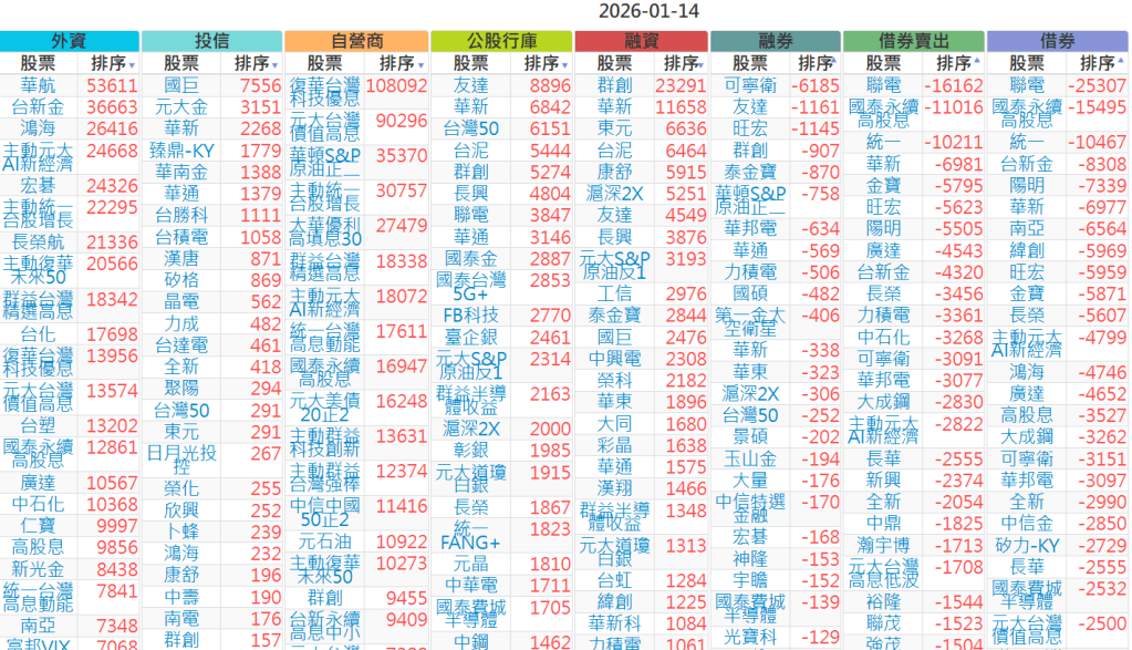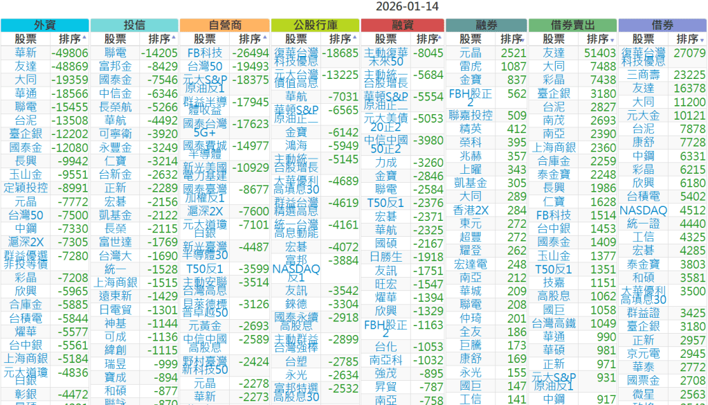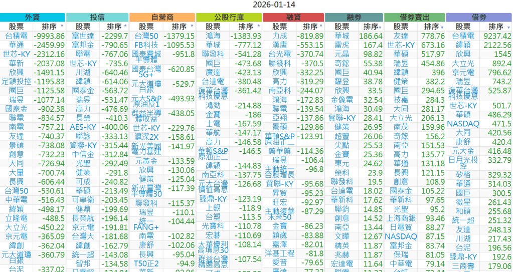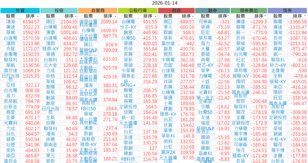 2026-0114【外資、投信】買賣超個股 2026-01-14 股狗網小編 投資誌-大盤 發表留言 上市:【外資、投信】買超(依金額) (單位:百萬) 上市:【外資、投信】賣超(依金額) (單位:百萬) 上市:【外資、投信】買超(依張數) (單位:張數) 上市:【外資、投信】賣超(依張數) (單位:張數) 免責宣言 本網站文章所提供資訊僅供參考,並無任何推介買賣之意,投資人應自行承擔交易風險。 分享此文: 按一下即可分享至 X(在新視窗中開啟) X 按一下以分享至 Facebook(在新視窗中開啟) Facebook 喜歡 正在載入...