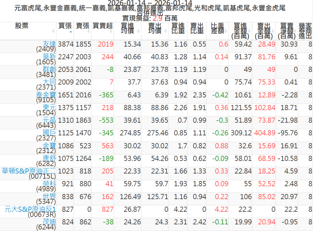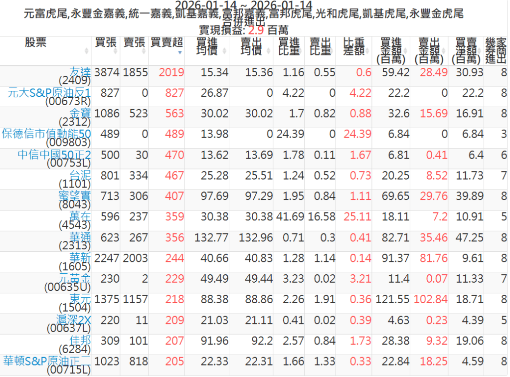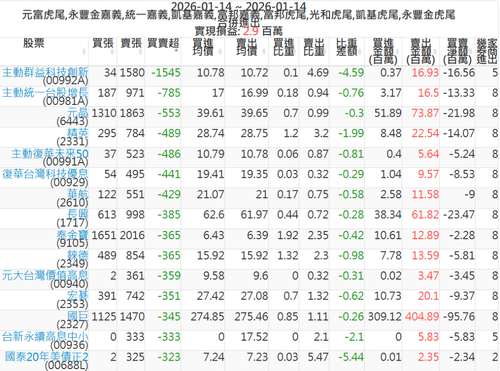 2026-0114主力買賣超個股 2026-01-14 股狗網小編 籌碼面每日資訊 發表留言 可參考下文 『如何查詢當沖、隔日沖分公司券商買賣』 主力當沖券商: 『元富虎尾』,『永豐金嘉義』,『統一嘉義』,『凱基嘉義』,『富邦嘉義』,『富邦虎尾』,『光和虎尾』,『凱基虎尾』,『永豐金虎尾』。 『當沖標的』 『買超股票』 『賣超股票』 免責宣言 本網站文章所提供資訊僅供參考,並無任何推介買賣之意,投資人應自行承擔交易風險。 分享此文: 按一下即可分享至 X(在新視窗中開啟) X 按一下以分享至 Facebook(在新視窗中開啟) Facebook 喜歡 正在載入...