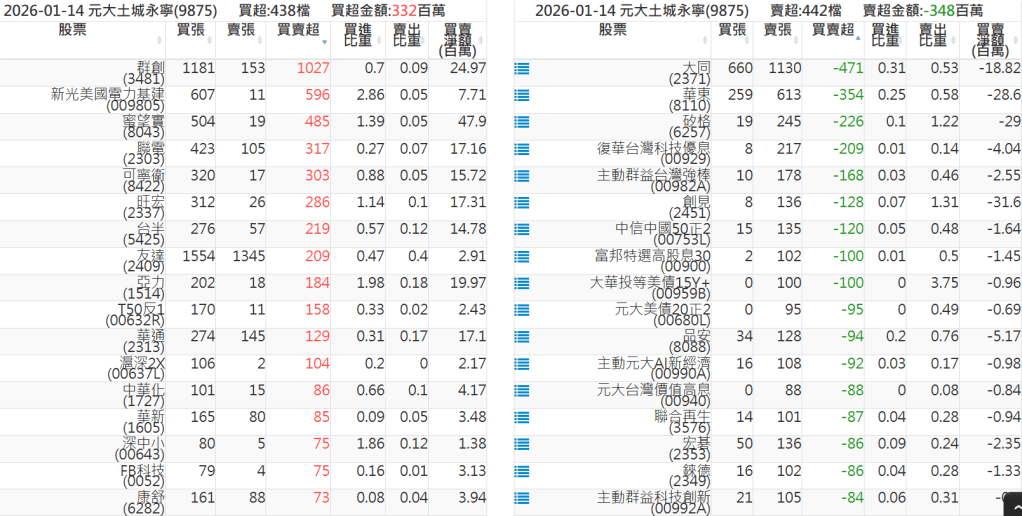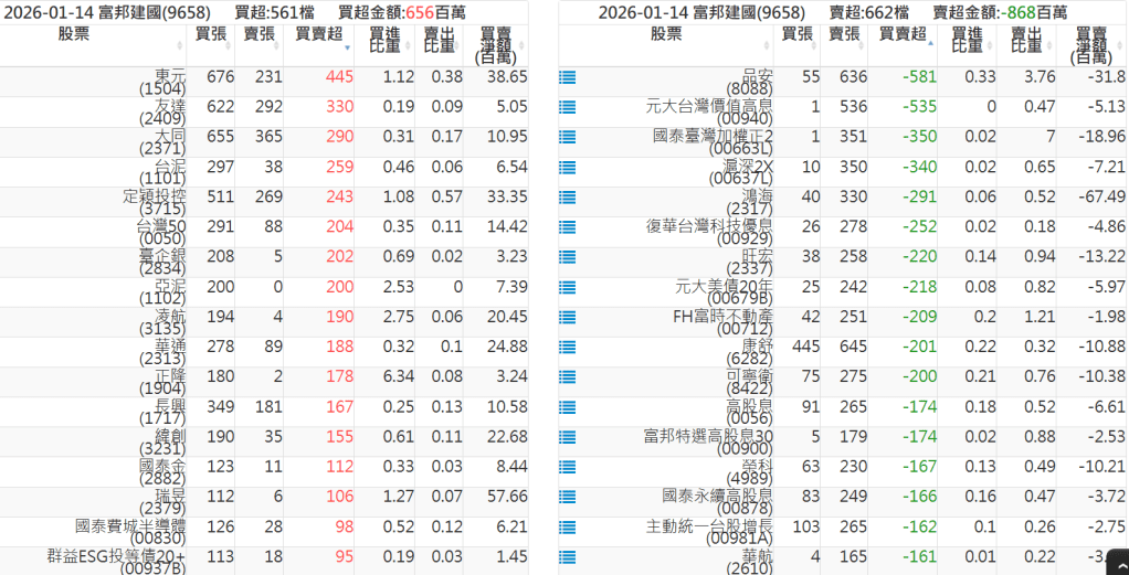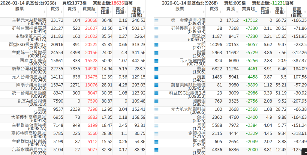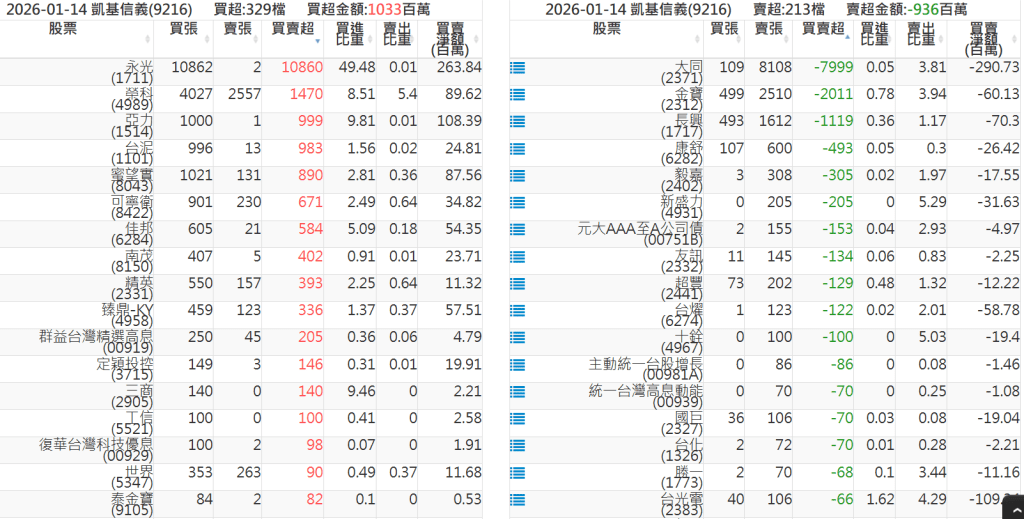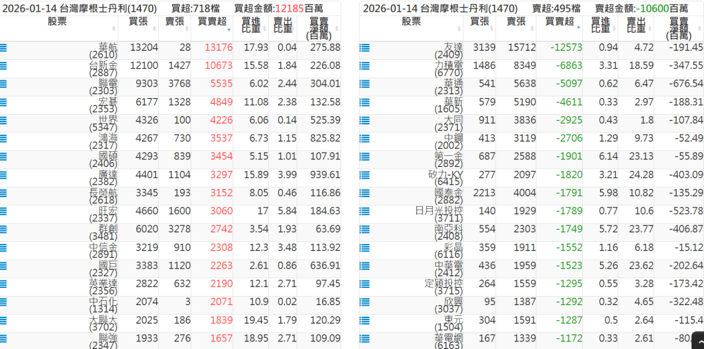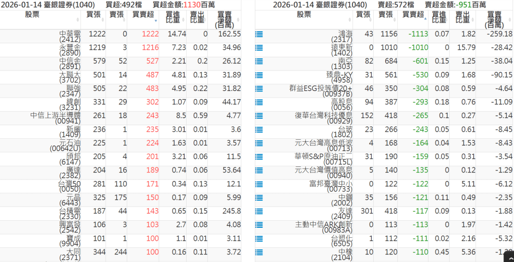 2026-0114關鍵券商買賣超 2026-01-14 股狗網小編 籌碼面每日資訊 發表留言 關鍵券商買賣超: 臺銀證券(1040): 台灣摩根士丹利(1470): 凱基台北(9268): 凱基信義(9216): 元大土城永寧(9875): 康和永和(845B) : 富邦建國(9658): 免責宣言 本網站文章所提供資訊僅供參考,並無任何推介買賣之意,投資人應自行承擔交易風險。 分享此文: 按一下即可分享至 X(在新視窗中開啟) X 按一下以分享至 Facebook(在新視窗中開啟) Facebook 喜歡 正在載入...