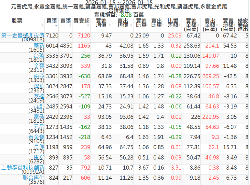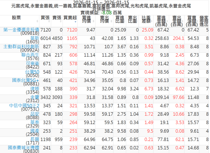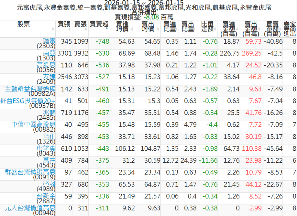 2026-0115主力買賣超個股 2026-01-15 股狗網小編 籌碼面每日資訊 發表留言 可參考下文 『如何查詢當沖、隔日沖分公司券商買賣』 主力當沖券商: 『元富虎尾』,『永豐金嘉義』,『統一嘉義』,『凱基嘉義』,『富邦嘉義』,『富邦虎尾』,『光和虎尾』,『凱基虎尾』,『永豐金虎尾』。 『當沖標的』 『買超股票』 『賣超股票』 免責宣言 本網站文章所提供資訊僅供參考,並無任何推介買賣之意,投資人應自行承擔交易風險。 分享此文: 分享到 X(在新視窗中開啟) X 分享到 Facebook(在新視窗中開啟) Facebook 喜歡 正在載入...