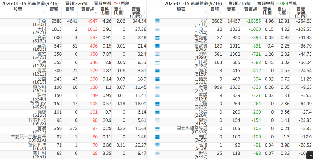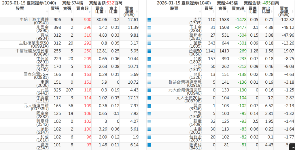 2026-0115關鍵券商買賣超 2026-01-15 股狗網小編 籌碼面每日資訊 發表留言 關鍵券商買賣超: 臺銀證券(1040): 台灣摩根士丹利(1470): 凱基台北(9268): 凱基信義(9216): 元大土城永寧(9875): 康和永和(845B) : 富邦建國(9658): 免責宣言 本網站文章所提供資訊僅供參考,並無任何推介買賣之意,投資人應自行承擔交易風險。 分享此文: 分享到 X(在新視窗中開啟) X 分享到 Facebook(在新視窗中開啟) Facebook 喜歡 正在載入...
