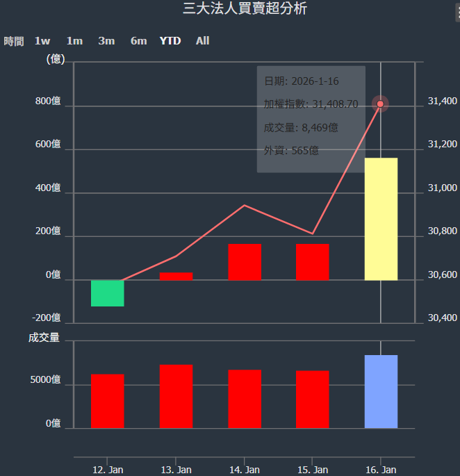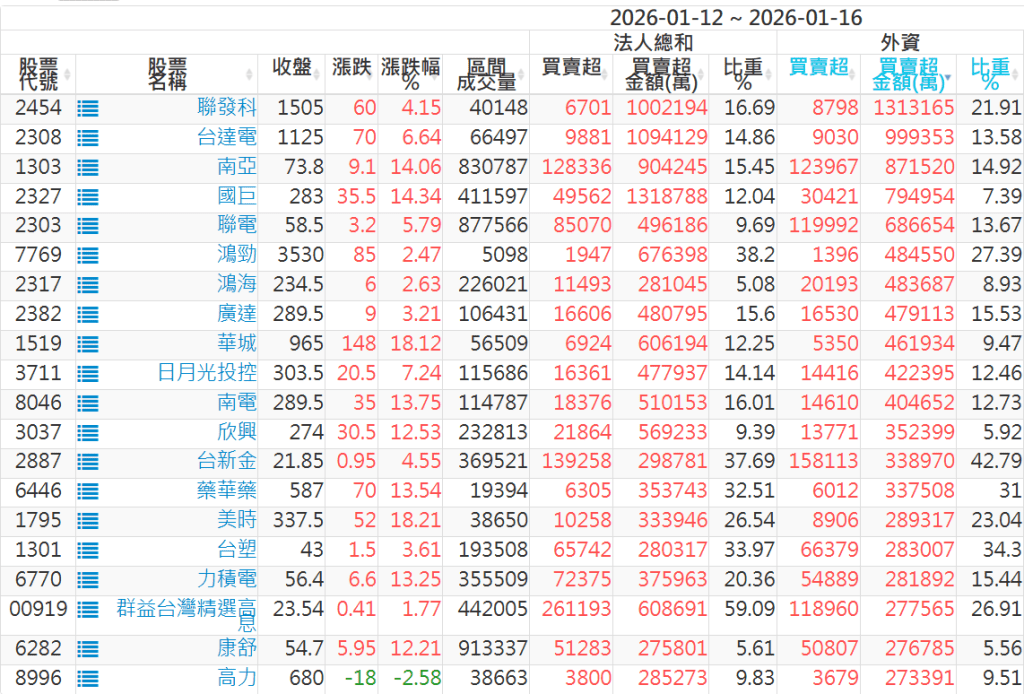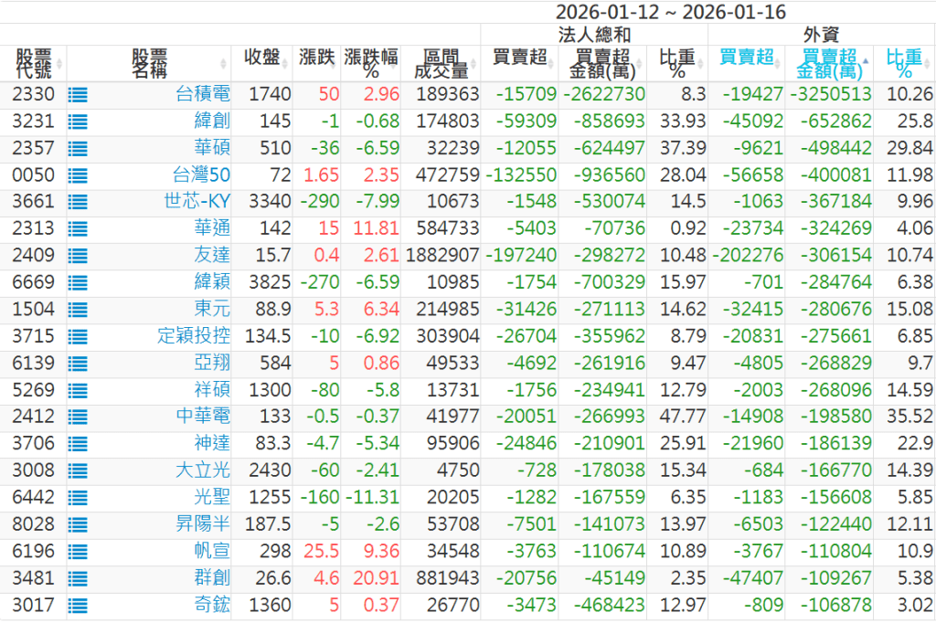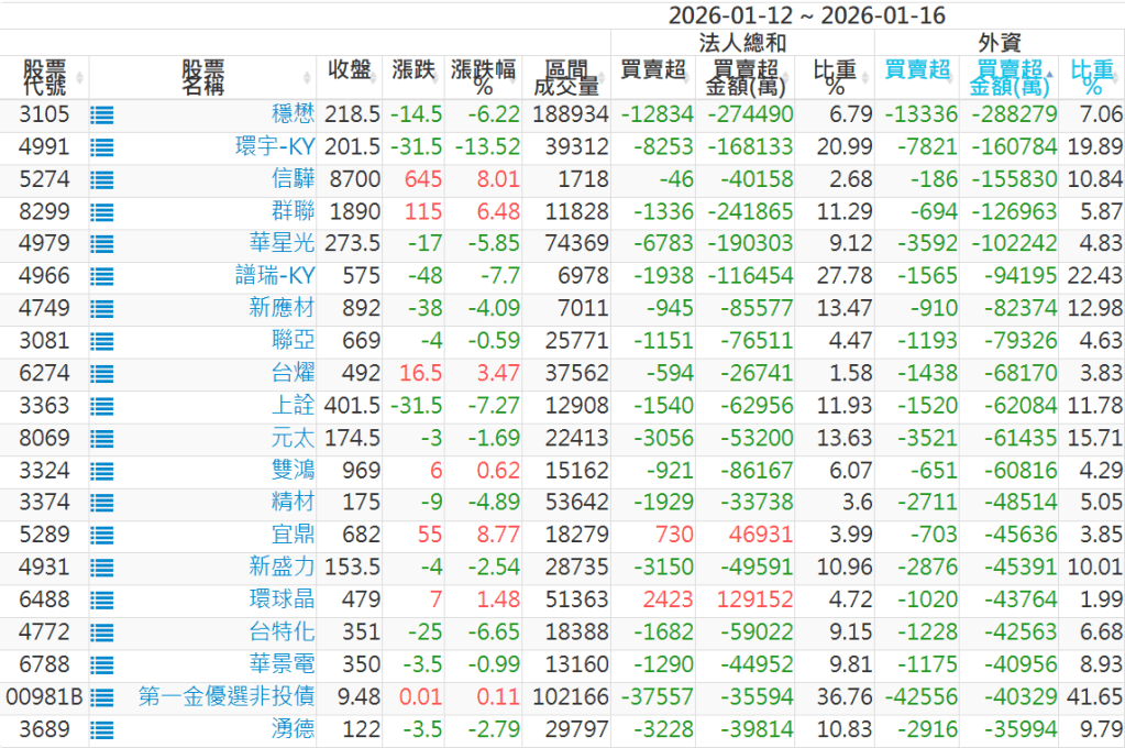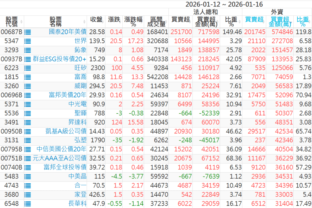 2026/01/12~2026/01/16近5日【外資】買賣超個股 2026-01-18 股狗網小編 投資誌-大盤 發表留言 外資本周累積【買超】約565億元。 【上市外資買超個股】(以金額排行,單位:萬) 【上市外資賣超個股】(以金額排行,單位:萬) 【上櫃外資買超個股】(以金額排行,單位:萬) 【上櫃外資賣超個股】(以金額排行,單位:萬) 免責宣言 本網站文章所提供資訊僅供參考,並無任何推介買賣之意,投資人應自行承擔交易風險。 分享此文: 分享到 X(在新視窗中開啟) X 分享到 Facebook(在新視窗中開啟) Facebook 喜歡 正在載入...