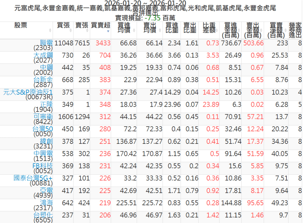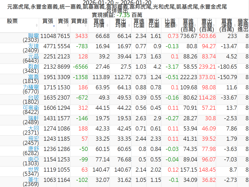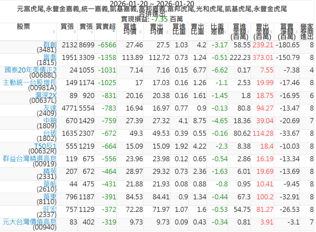 2026-0120主力買賣超個股 2026-01-20 股狗網小編 籌碼面每日資訊 發表留言 可參考下文 『如何查詢當沖、隔日沖分公司券商買賣』 主力當沖券商: 『元富虎尾』,『永豐金嘉義』,『統一嘉義』,『凱基嘉義』,『富邦嘉義』,『富邦虎尾』,『光和虎尾』,『凱基虎尾』,『永豐金虎尾』。 『當沖標的』 『買超股票』 『賣超股票』 免責宣言 本網站文章所提供資訊僅供參考,並無任何推介買賣之意,投資人應自行承擔交易風險。 分享此文: 分享到 X(在新視窗中開啟) X 分享到 Facebook(在新視窗中開啟) Facebook 喜歡 正在載入...