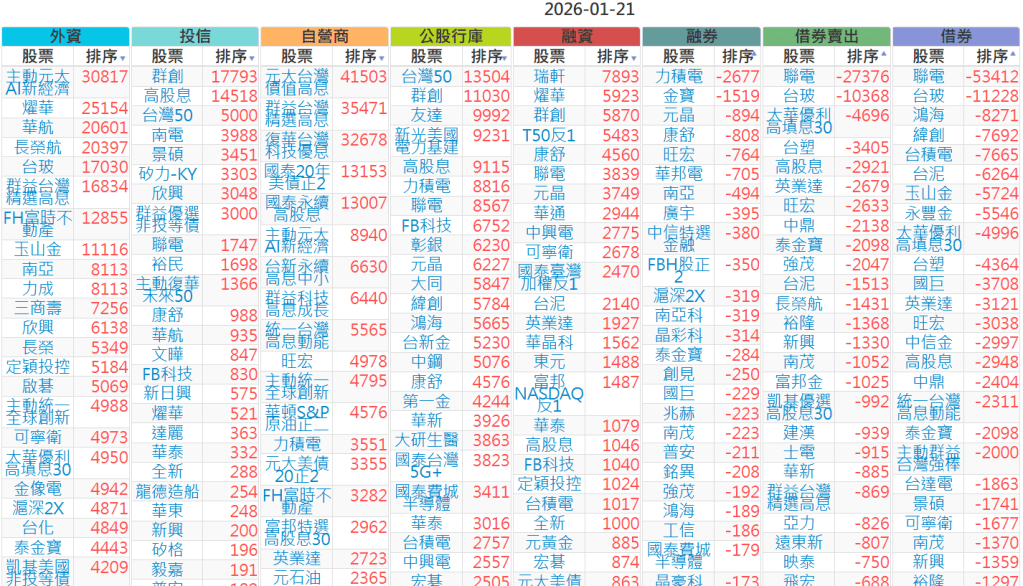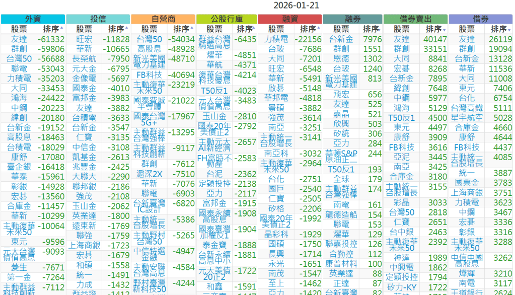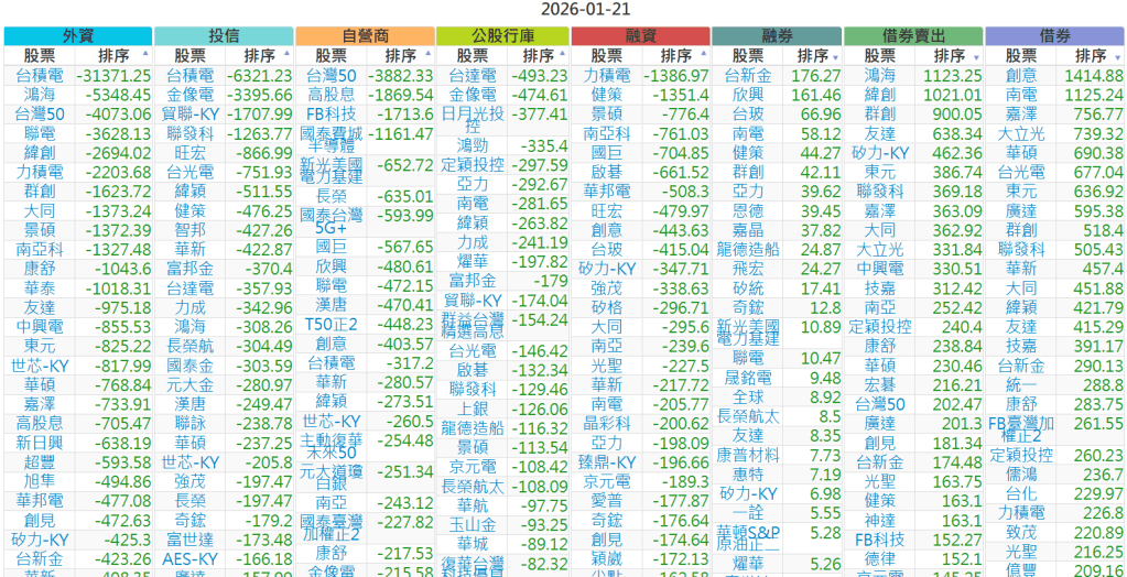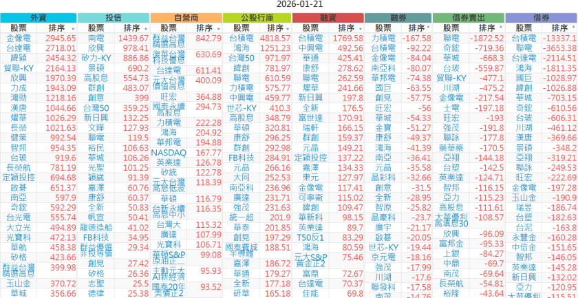 2026-0121【外資、投信】買賣超個股 2026-01-21 股狗網小編 投資誌-大盤 發表留言 上市:【外資、投信】買超(依金額) (單位:百萬) 上市:【外資、投信】賣超(依金額) (單位:百萬) 上市:【外資、投信】買超(依張數) (單位:張數) 上市:【外資、投信】賣超(依張數) (單位:張數) 免責宣言 本網站文章所提供資訊僅供參考,並無任何推介買賣之意,投資人應自行承擔交易風險。 分享此文: 分享到 X(在新視窗中開啟) X 分享到 Facebook(在新視窗中開啟) Facebook 喜歡 正在載入...