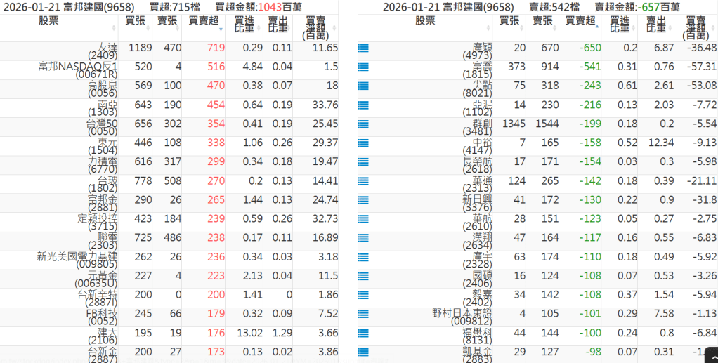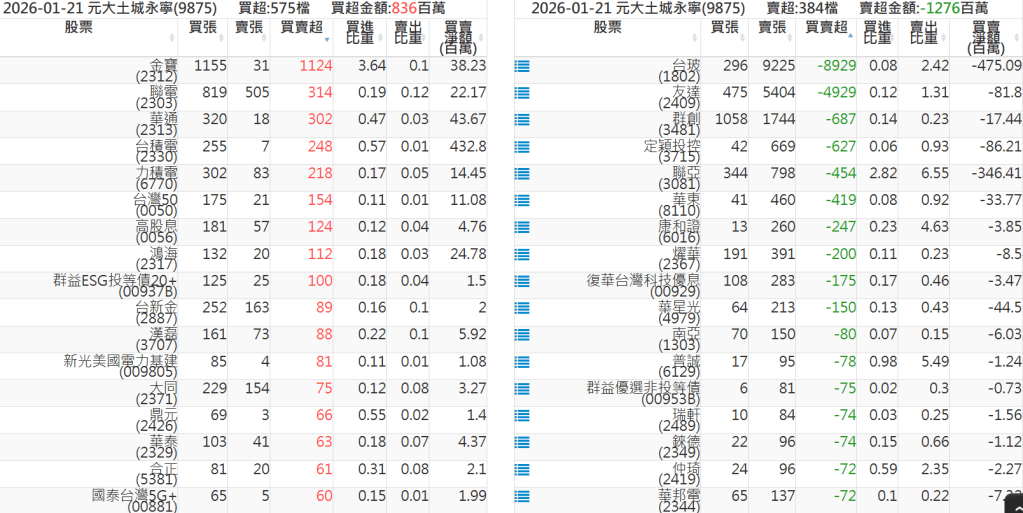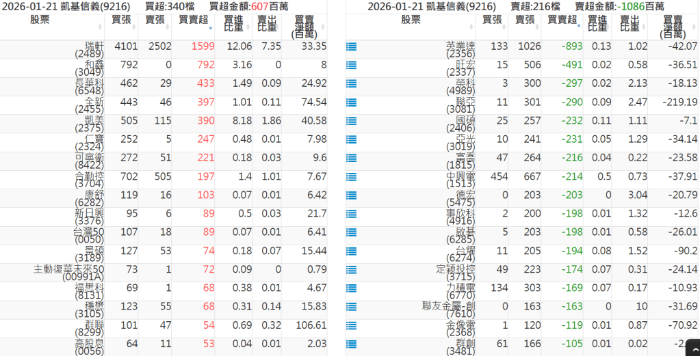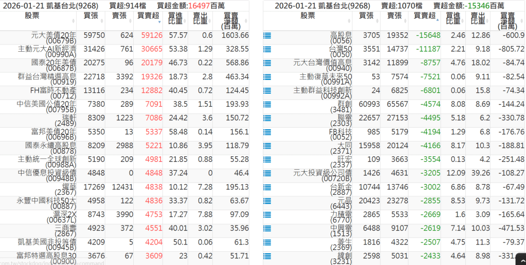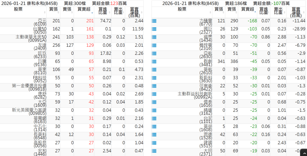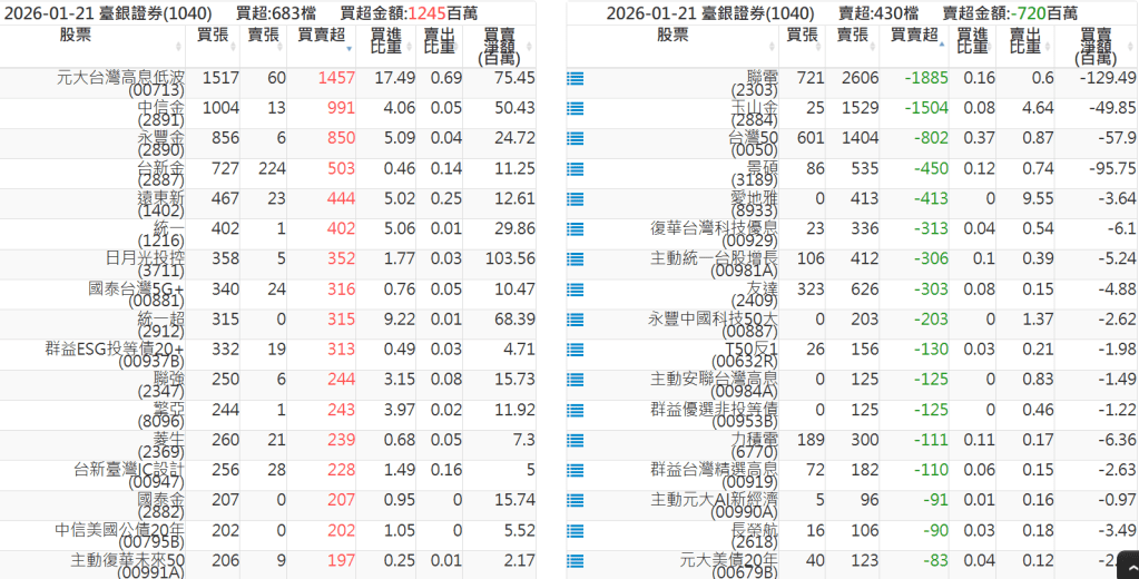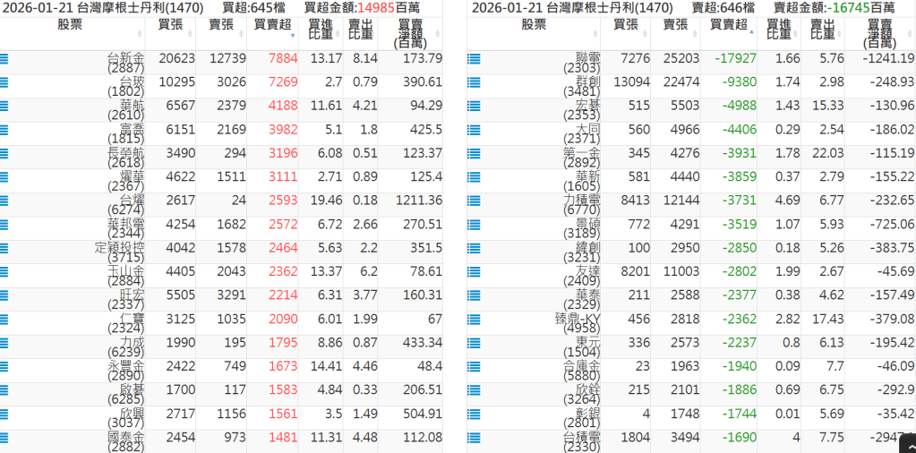 2026-0121關鍵券商買賣超 2026-01-21 股狗網小編 籌碼面每日資訊 發表留言 關鍵券商買賣超: 臺銀證券(1040): 台灣摩根士丹利(1470): 凱基台北(9268): 凱基信義(9216): 元大土城永寧(9875): 康和永和(845B) : 富邦建國(9658): 免責宣言 本網站文章所提供資訊僅供參考,並無任何推介買賣之意,投資人應自行承擔交易風險。 分享此文: 分享到 X(在新視窗中開啟) X 分享到 Facebook(在新視窗中開啟) Facebook 喜歡 正在載入...