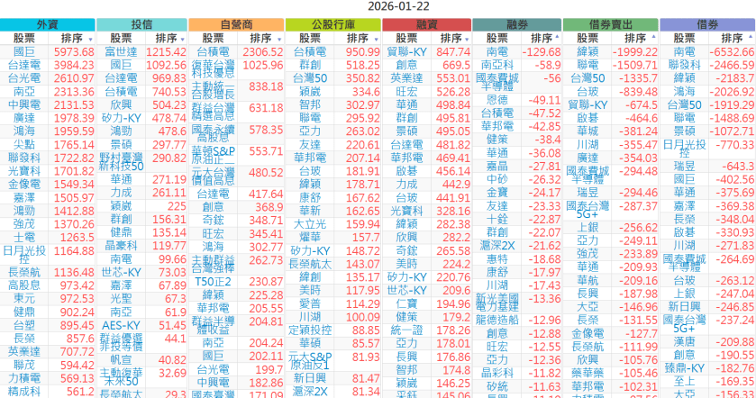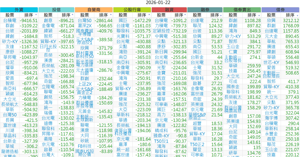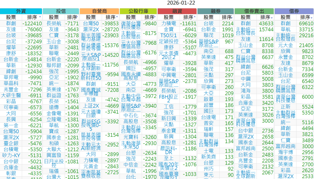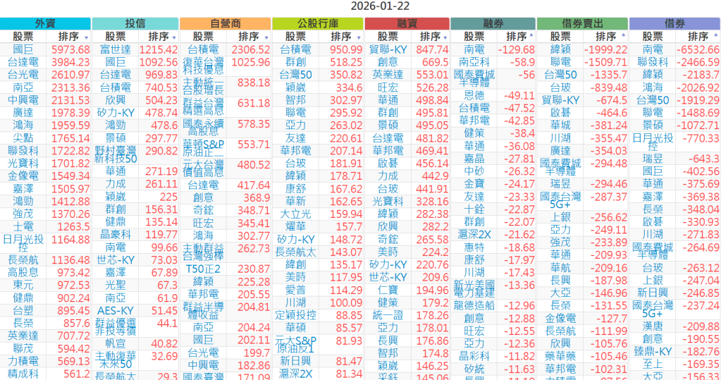 2026-0122【外資、投信】買賣超個股 2026-01-22 股狗網小編 投資誌-大盤 發表留言 上市:【外資、投信】買超(依金額) (單位:百萬) 上市:【外資、投信】賣超(依金額) (單位:百萬) 上市:【外資、投信】買超(依張數) (單位:張數) 上市:【外資、投信】賣超(依張數) (單位:張數) 免責宣言 本網站文章所提供資訊僅供參考,並無任何推介買賣之意,投資人應自行承擔交易風險。 分享此文: 分享到 X(在新視窗中開啟) X 分享到 Facebook(在新視窗中開啟) Facebook 喜歡 正在載入...