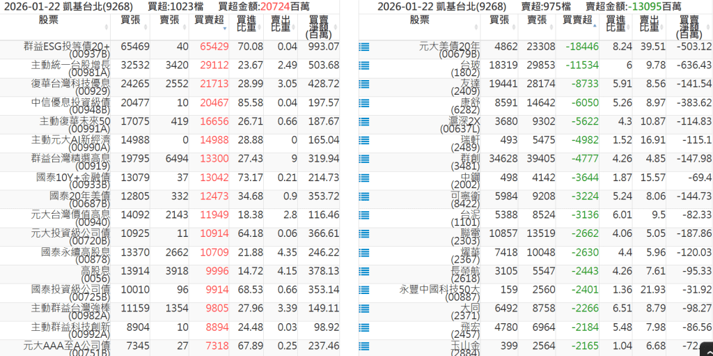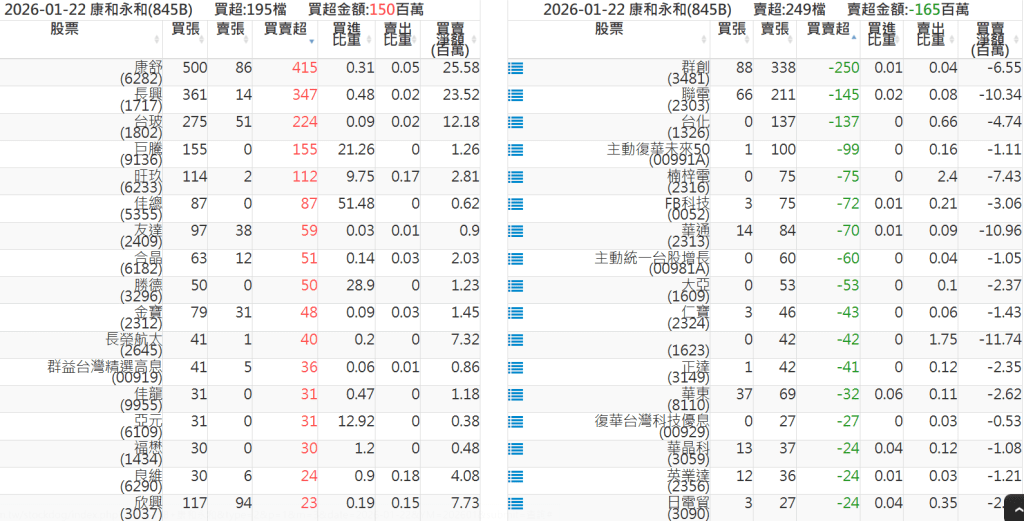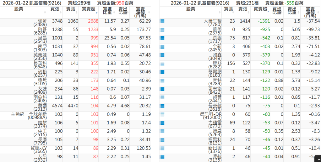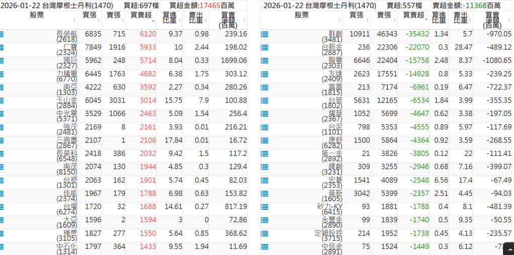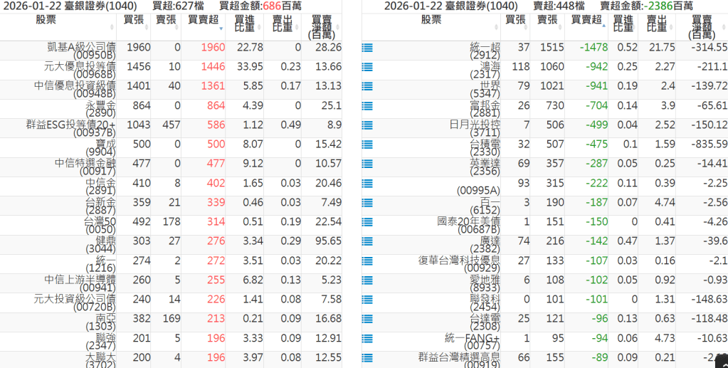 2026-0122關鍵券商買賣超 2026-01-22 股狗網小編 籌碼面每日資訊 發表留言 關鍵券商買賣超: 臺銀證券(1040): 台灣摩根士丹利(1470): 凱基台北(9268): 凱基信義(9216): 元大土城永寧(9875): 康和永和(845B) : 富邦建國(9658): 免責宣言 本網站文章所提供資訊僅供參考,並無任何推介買賣之意,投資人應自行承擔交易風險。 分享此文: 分享到 X(在新視窗中開啟) X 分享到 Facebook(在新視窗中開啟) Facebook 喜歡 正在載入...