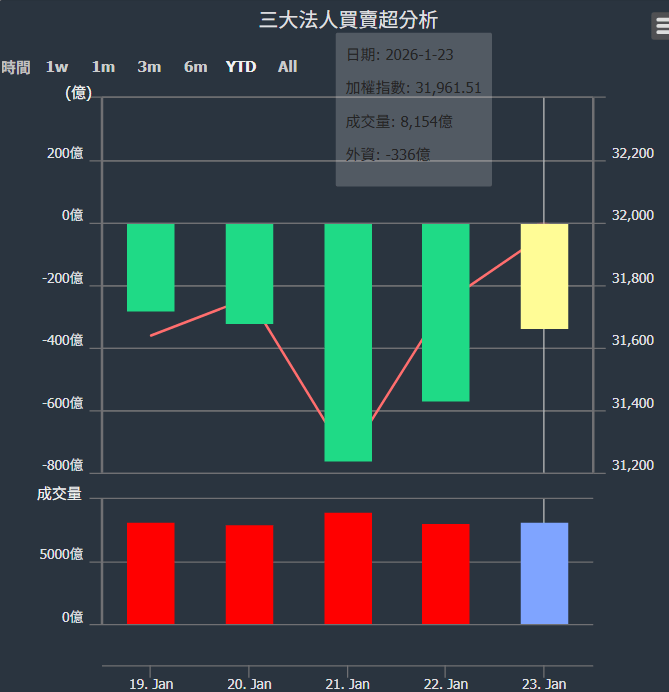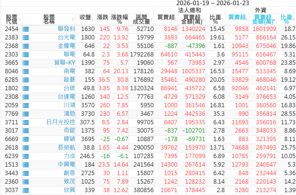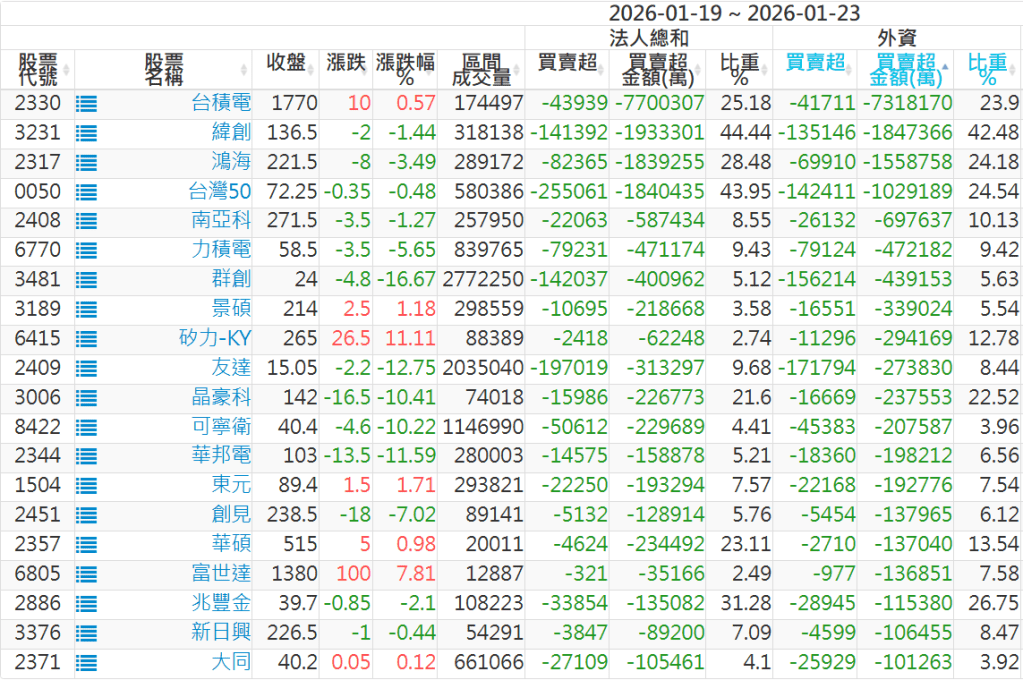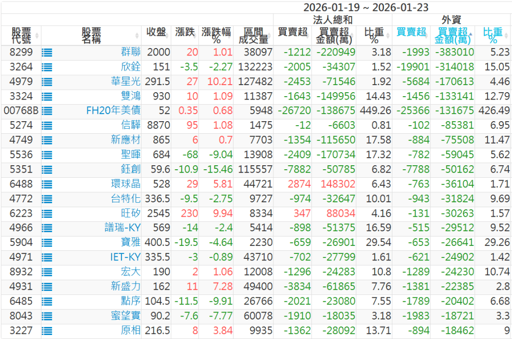2026/01/19~2026/01/23近5日【外資】買賣超個股 2026-01-25 股狗網小編 投資誌-大盤 發表留言 外資本周累積【賣超】約336億元。 【上市外資買超個股】(以金額排行,單位:萬) 【上市外資賣超個股】(以金額排行,單位:萬) 【上櫃外資買超個股】(以金額排行,單位:萬) 【上櫃外資賣超個股】(以金額排行,單位:萬) 免責宣言 本網站文章所提供資訊僅供參考,並無任何推介買賣之意,投資人應自行承擔交易風險。 分享此文: 分享到 X(在新視窗中開啟) X 分享到 Facebook(在新視窗中開啟) Facebook 喜歡 正在載入...