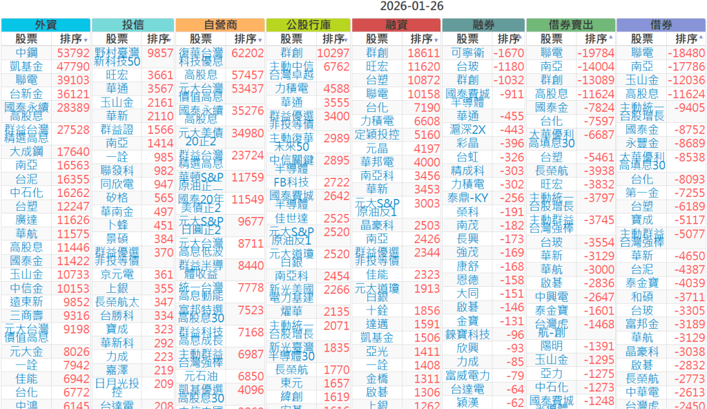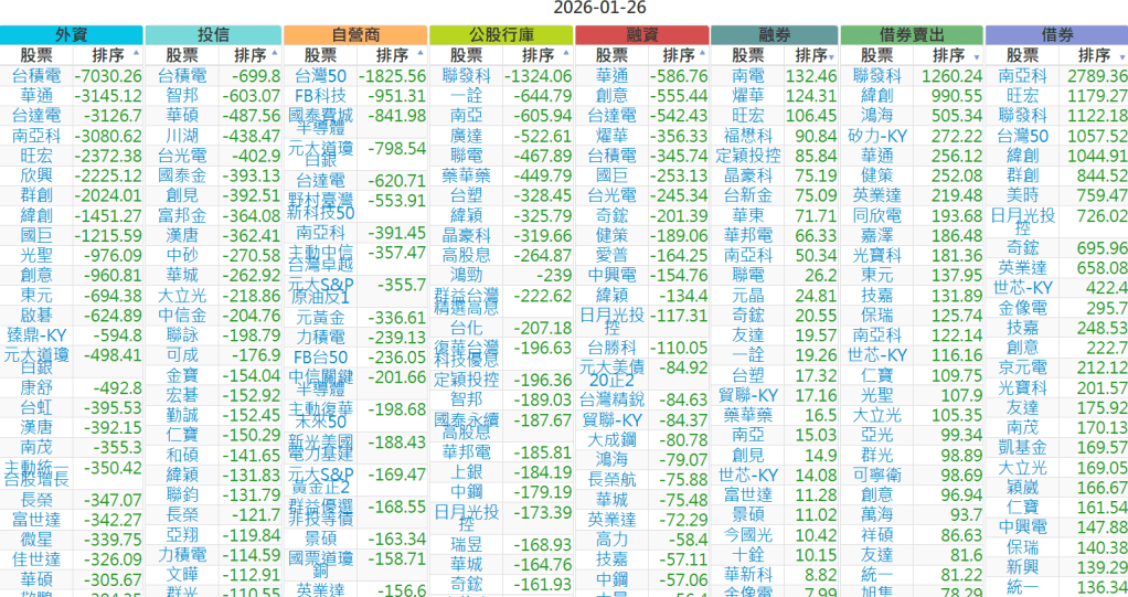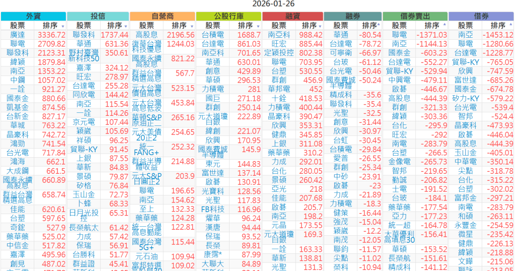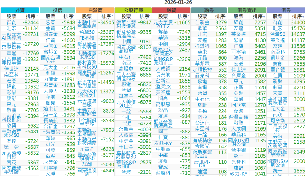 2026-0126【外資、投信】買賣超個股 2026-01-26 aindex168 投資誌-大盤 發表留言 上市:【外資、投信】買超(依金額) (單位:百萬) 上市:【外資、投信】賣超(依金額) (單位:百萬) 上市:【外資、投信】買超(依張數) (單位:張數) 上市:【外資、投信】賣超(依張數) (單位:張數) 免責宣言 本網站文章所提供資訊僅供參考,並無任何推介買賣之意,投資人應自行承擔交易風險。 分享此文: 分享到 X(在新視窗中開啟) X 分享到 Facebook(在新視窗中開啟) Facebook 喜歡 正在載入...