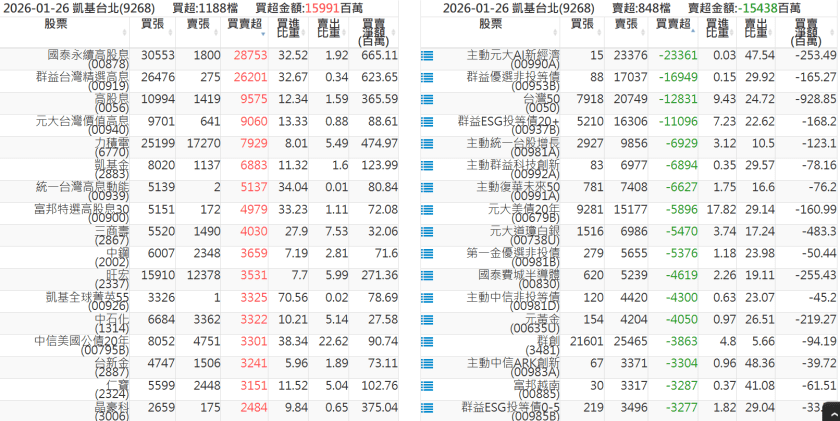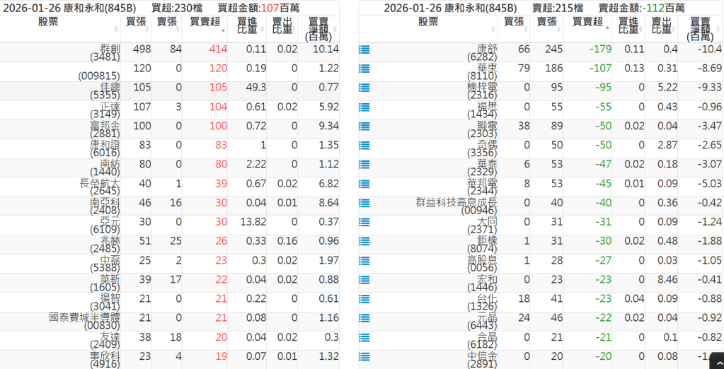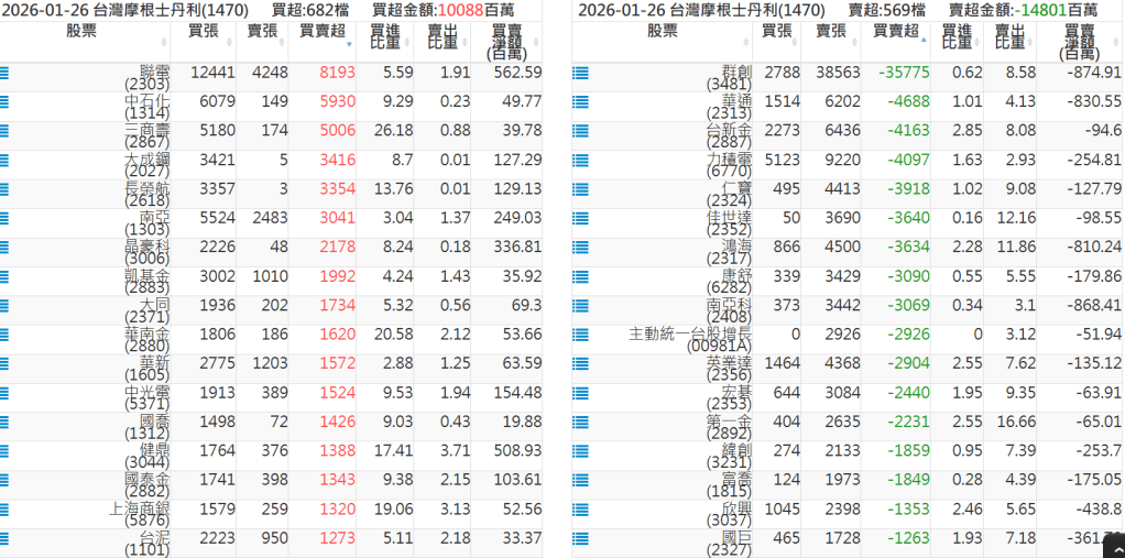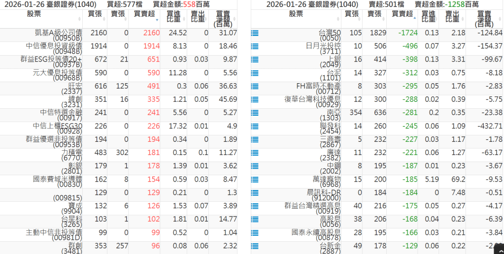 2026-0126關鍵券商買賣超 2026-01-26 股狗網小編 籌碼面每日資訊 發表留言 關鍵券商買賣超: 臺銀證券(1040): 台灣摩根士丹利(1470): 凱基台北(9268): 凱基信義(9216): 元大土城永寧(9875): 康和永和(845B) : 富邦建國(9658): 免責宣言 本網站文章所提供資訊僅供參考,並無任何推介買賣之意,投資人應自行承擔交易風險。 分享此文: 分享到 X(在新視窗中開啟) X 分享到 Facebook(在新視窗中開啟) Facebook 喜歡 正在載入...