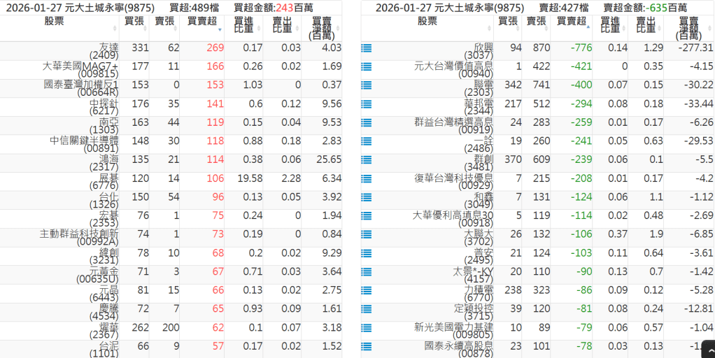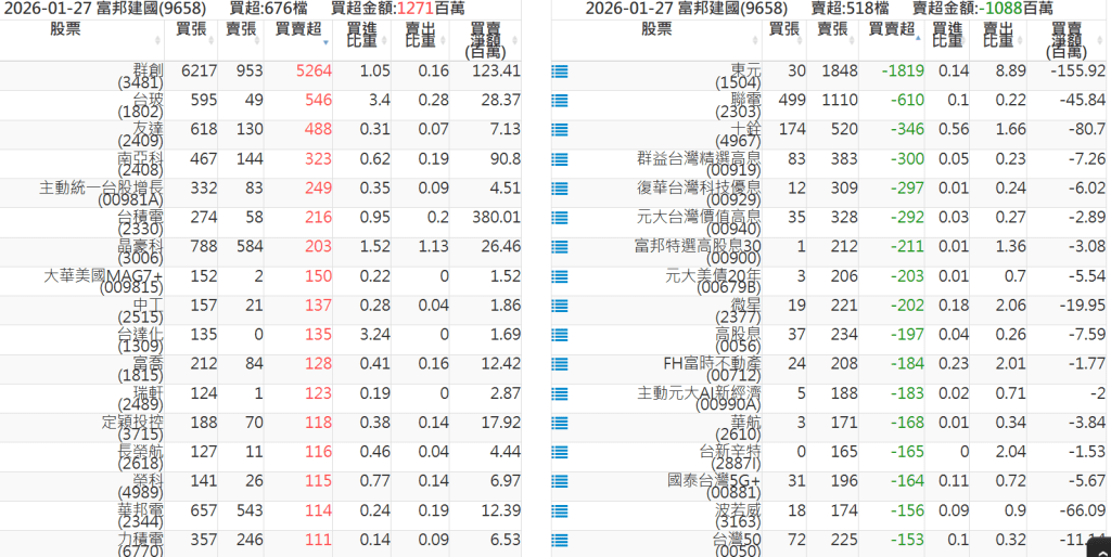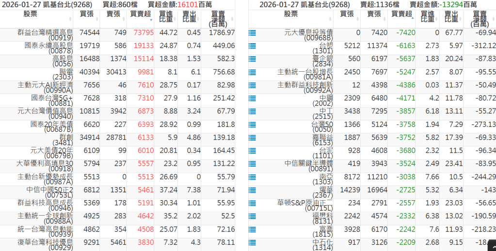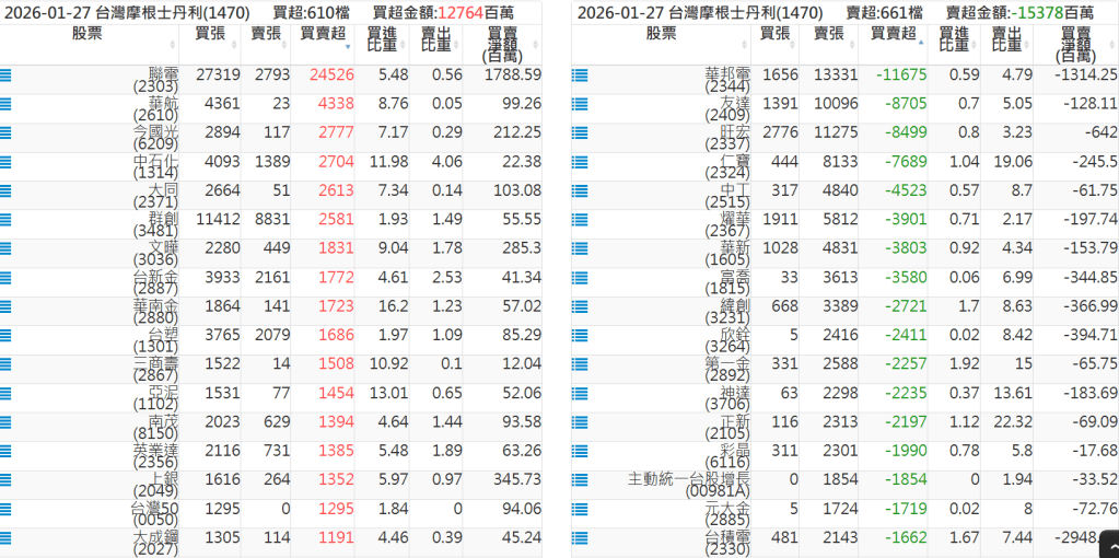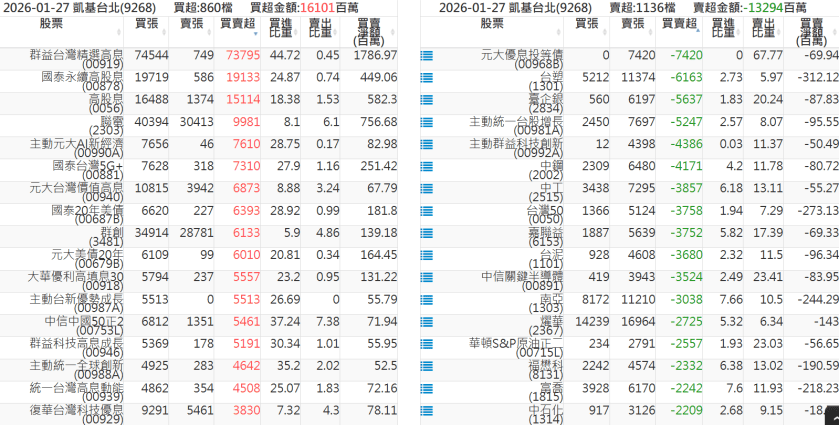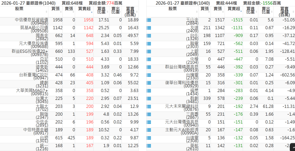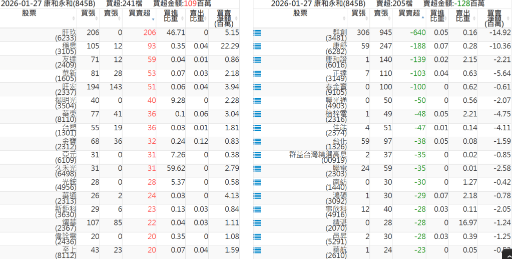 2026-0127關鍵券商買賣超 2026-01-27 股狗網小編 籌碼面每日資訊 發表留言 關鍵券商買賣超: 臺銀證券(1040): 台灣摩根士丹利(1470): 凱基台北(9268): 凱基信義(9216): 元大土城永寧(9875): 康和永和(845B) : 富邦建國(9658): 免責宣言 本網站文章所提供資訊僅供參考,並無任何推介買賣之意,投資人應自行承擔交易風險。 分享此文: 分享到 X(在新視窗中開啟) X 分享到 Facebook(在新視窗中開啟) Facebook 喜歡 正在載入...