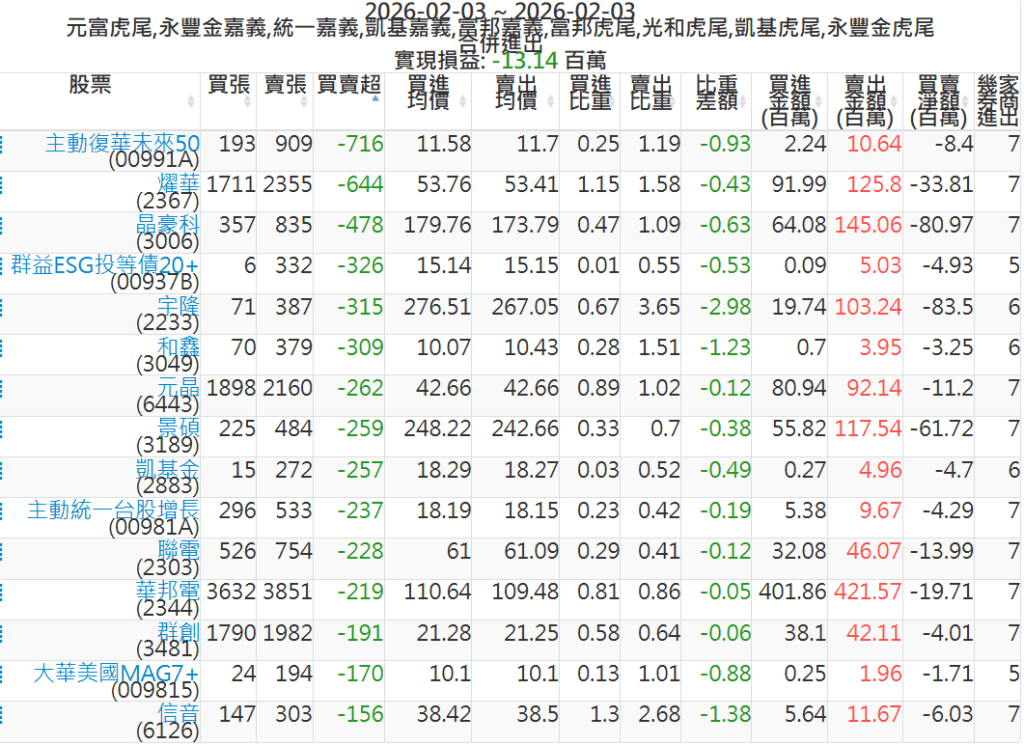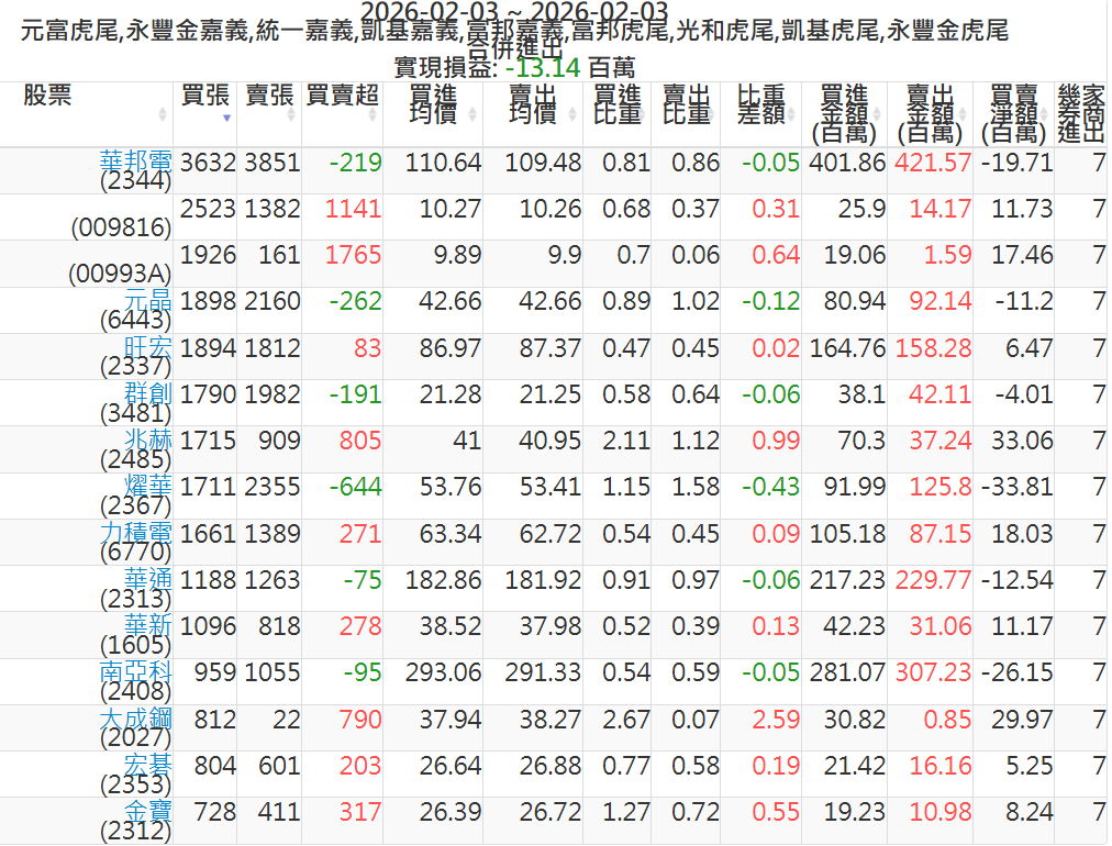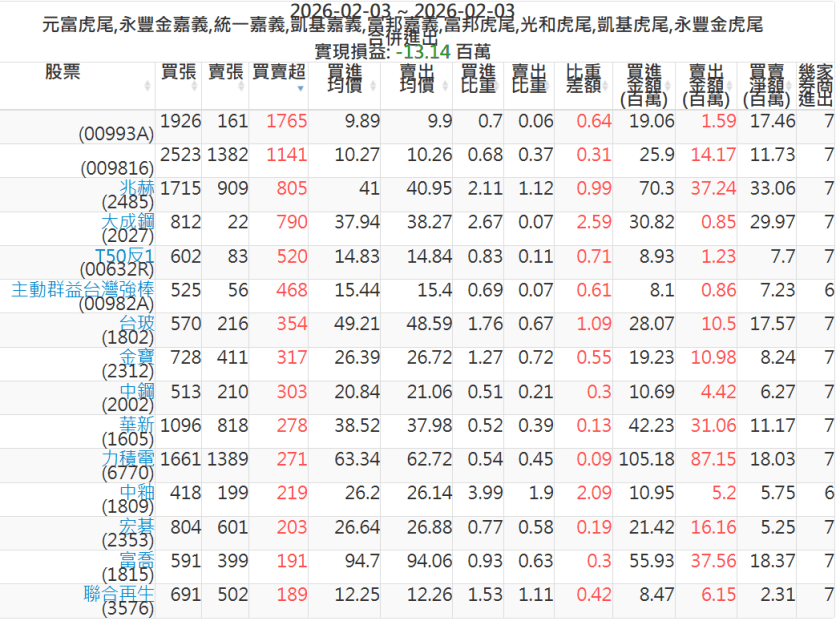 2026-0203主力買賣超個股 2026-02-03 股狗網小編 籌碼面每日資訊 發表留言 可參考下文 『如何查詢當沖、隔日沖分公司券商買賣』 主力當沖券商: 『元富虎尾』,『永豐金嘉義』,『統一嘉義』,『凱基嘉義』,『富邦嘉義』,『富邦虎尾』,『光和虎尾』,『凱基虎尾』,『永豐金虎尾』。 『當沖標的』 『買超股票』 『賣超股票』 免責宣言 本網站文章所提供資訊僅供參考,並無任何推介買賣之意,投資人應自行承擔交易風險。 分享此文: 分享到 X(在新視窗中開啟) X 分享到 Facebook(在新視窗中開啟) Facebook 喜歡 正在載入...