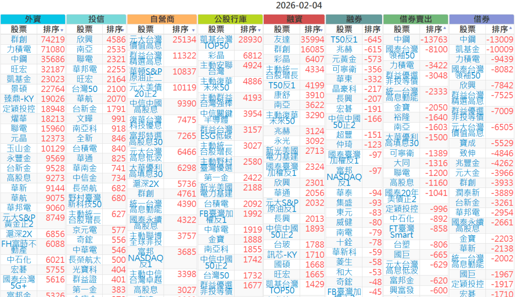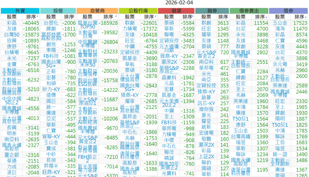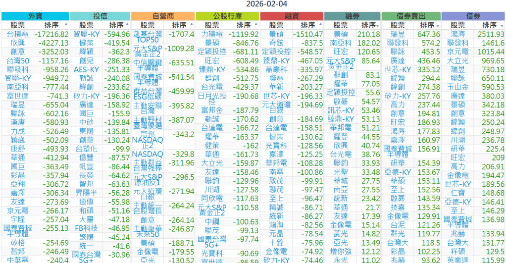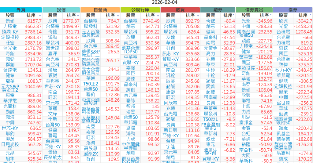 2026-0204【外資、投信】買賣超個股 2026-02-04 股狗網小編 投資誌-大盤 發表留言 上市:【外資、投信】買超(依金額) (單位:百萬) 上市:【外資、投信】賣超(依金額) (單位:百萬) 上市:【外資、投信】買超(依張數) (單位:張數) 上市:【外資、投信】賣超(依張數) (單位:張數) 免責宣言 本網站文章所提供資訊僅供參考,並無任何推介買賣之意,投資人應自行承擔交易風險。 分享此文: 分享到 X(在新視窗中開啟) X 分享到 Facebook(在新視窗中開啟) Facebook 喜歡 正在載入...