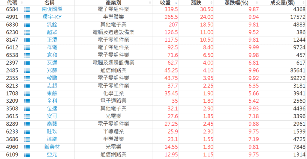 2026-0204日新高爆量上漲股 2026-02-04 股狗網小編 選股條件 發表留言 利用股狗選股的選股條件可以【挑選突破20日新高,爆量上漲起漲點股票】 1.股狗選股 https://www.stockdog.com.tw 2.選股條件: a.收盤價創20日新高 b.當日漲幅 > 2% C.成交量大於5日均量2倍 免責宣言 本網站文章所提供資訊僅供參考,並無任何推介買賣之意,投資人應自行承擔交易風險。 分享此文: 分享到 X(在新視窗中開啟) X 分享到 Facebook(在新視窗中開啟) Facebook 喜歡 正在載入...