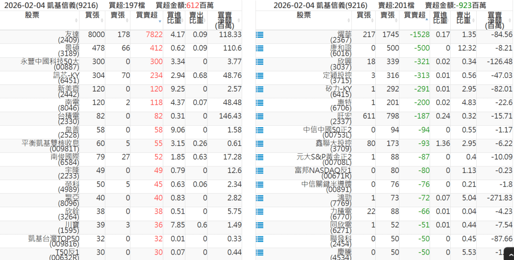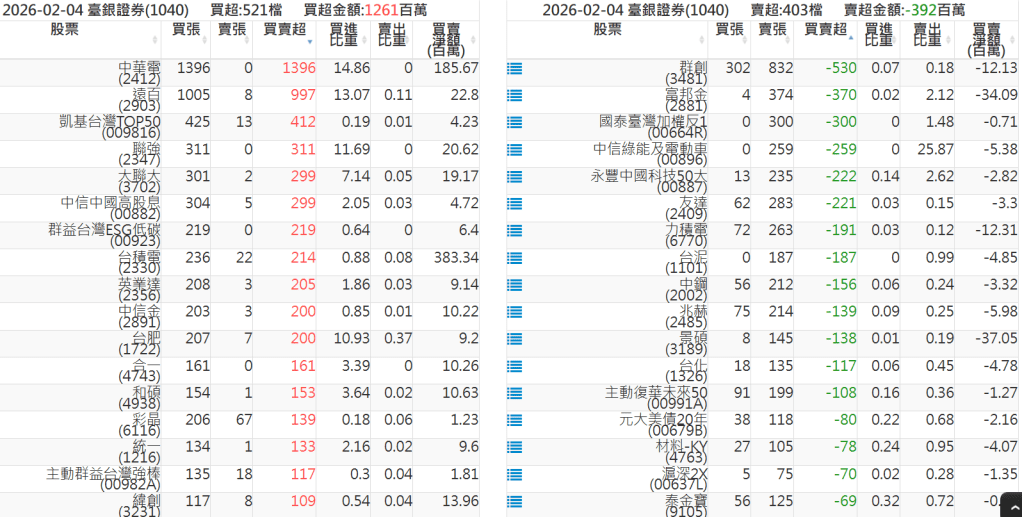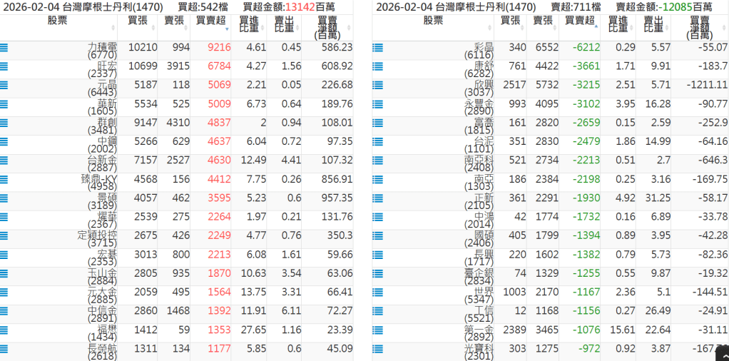 2026-0204關鍵券商買賣超 2026-02-04 股狗網小編 籌碼面每日資訊 發表留言 關鍵券商買賣超: 臺銀證券(1040): 台灣摩根士丹利(1470): 凱基台北(9268): 凱基信義(9216): 元大土城永寧(9875): 康和永和(845B) : 富邦建國(9658): 免責宣言 本網站文章所提供資訊僅供參考,並無任何推介買賣之意,投資人應自行承擔交易風險。 分享此文: 分享到 X(在新視窗中開啟) X 分享到 Facebook(在新視窗中開啟) Facebook 喜歡 正在載入...