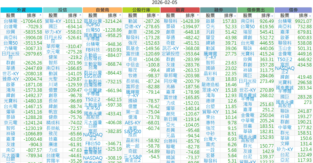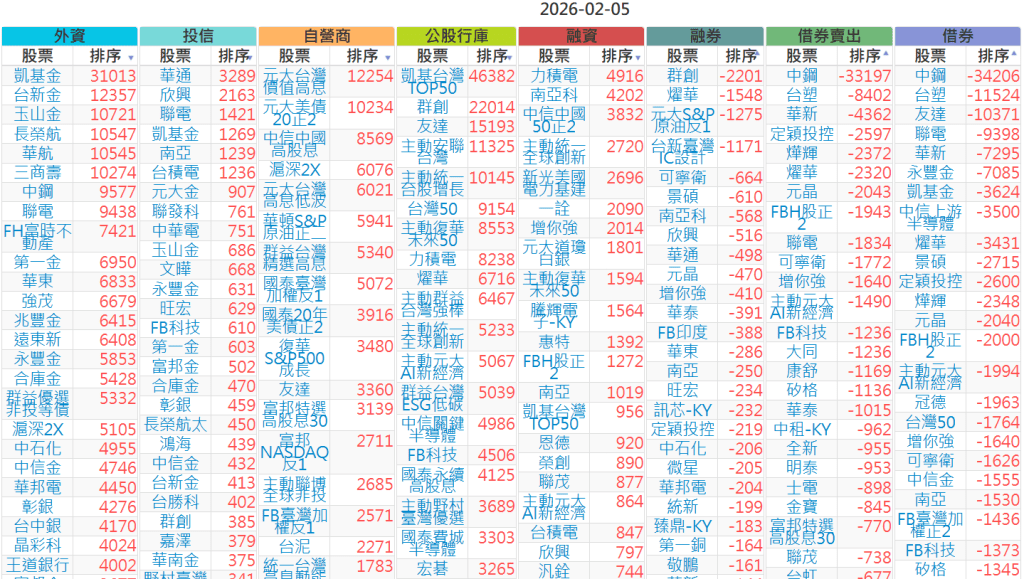 2026-0205【外資、投信】買賣超個股 2026-02-05 股狗網小編 投資誌-大盤 發表留言 上市:【外資、投信】買超(依金額) (單位:百萬) 上市:【外資、投信】賣超(依金額) (單位:百萬) 上市:【外資、投信】買超(依張數) (單位:張數) 上市:【外資、投信】賣超(依張數) (單位:張數) 免責宣言 本網站文章所提供資訊僅供參考,並無任何推介買賣之意,投資人應自行承擔交易風險。 分享此文: 分享到 X(在新視窗中開啟) X 分享到 Facebook(在新視窗中開啟) Facebook 喜歡 正在載入...