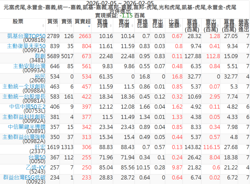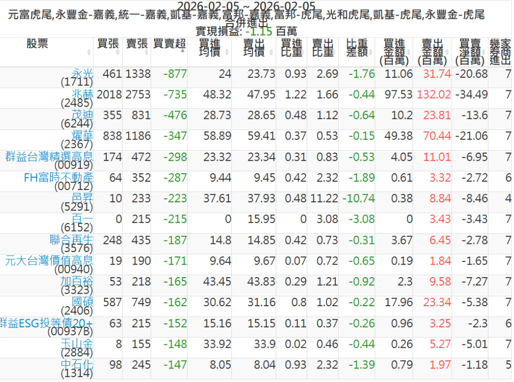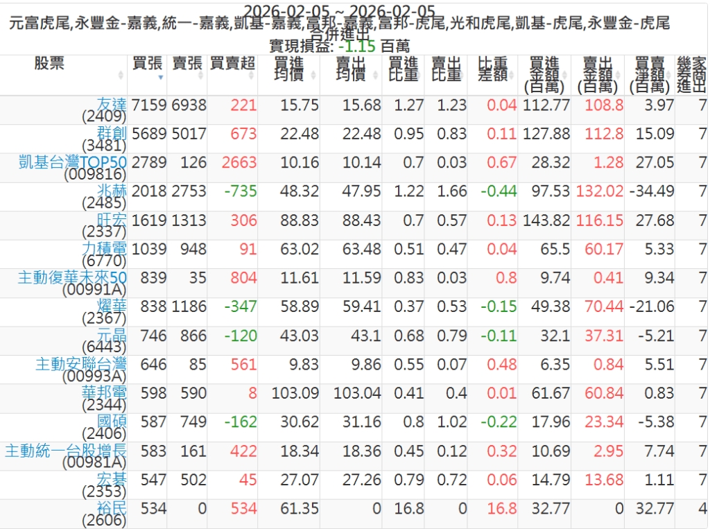 2026-0205主力買賣超個股 2026-02-05 股狗網小編 籌碼面每日資訊 發表留言 可參考下文 『如何查詢當沖、隔日沖分公司券商買賣』 主力當沖券商: 『元富虎尾』,『永豐金嘉義』,『統一嘉義』,『凱基嘉義』,『富邦嘉義』,『富邦虎尾』,『光和虎尾』,『凱基虎尾』,『永豐金虎尾』。 『當沖標的』 『買超股票』 『賣超股票』 免責宣言 本網站文章所提供資訊僅供參考,並無任何推介買賣之意,投資人應自行承擔交易風險。 分享此文: 分享到 X(在新視窗中開啟) X 分享到 Facebook(在新視窗中開啟) Facebook 喜歡 正在載入...