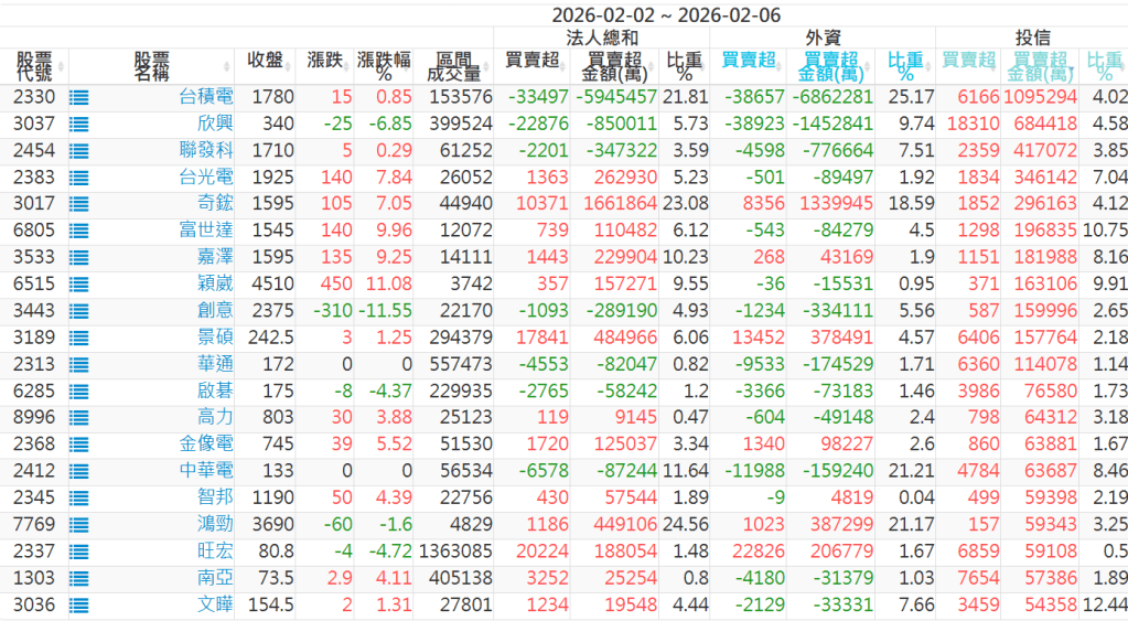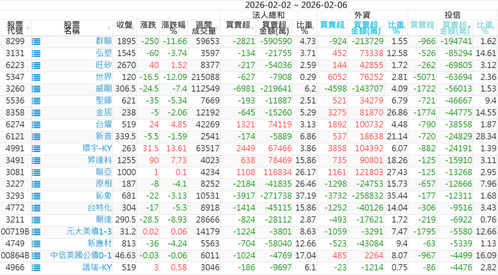 2026/02/02~2026/02/06近5日【投信】買賣超個股 2026-02-08 股狗網小編 投資誌-大盤 發表留言 【上市投信買超個股】(以金額排行,單位:萬) 【上市投信賣超個股】(以金額排行,單位:萬) 【上櫃投信買超個股】(以金額排行,單位:萬) 【上櫃投信賣超個股】(以金額排行,單位:萬) 免責宣言 本網站文章所提供資訊僅供參考,並無任何推介買賣之意,投資人應自行承擔交易風險。 分享此文: 分享到 X(在新視窗中開啟) X 分享到 Facebook(在新視窗中開啟) Facebook 喜歡 正在載入...
