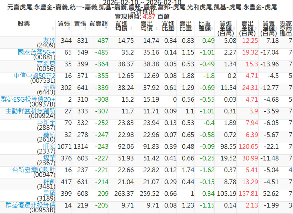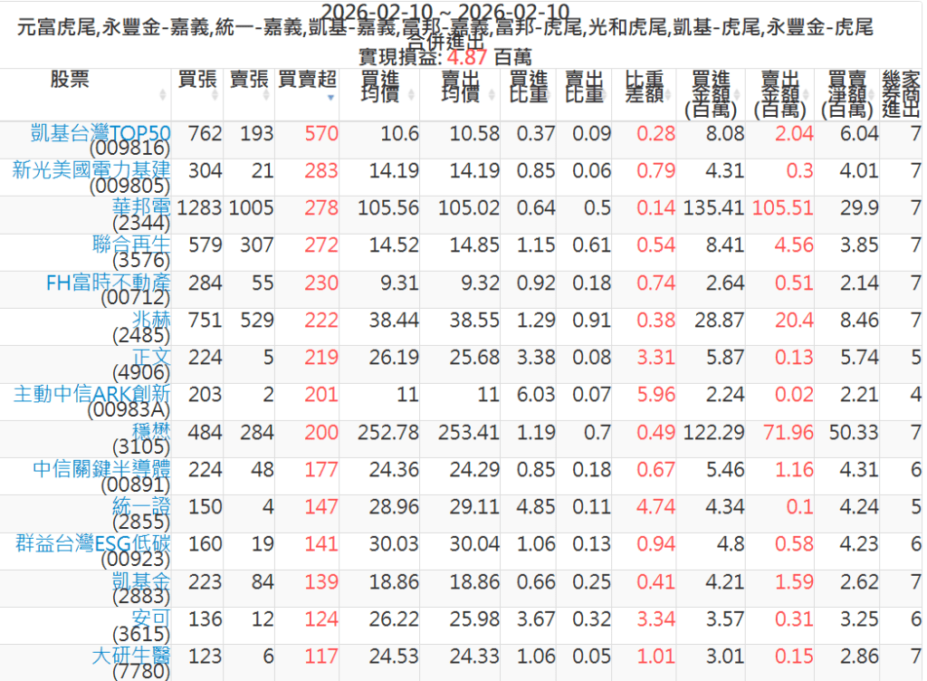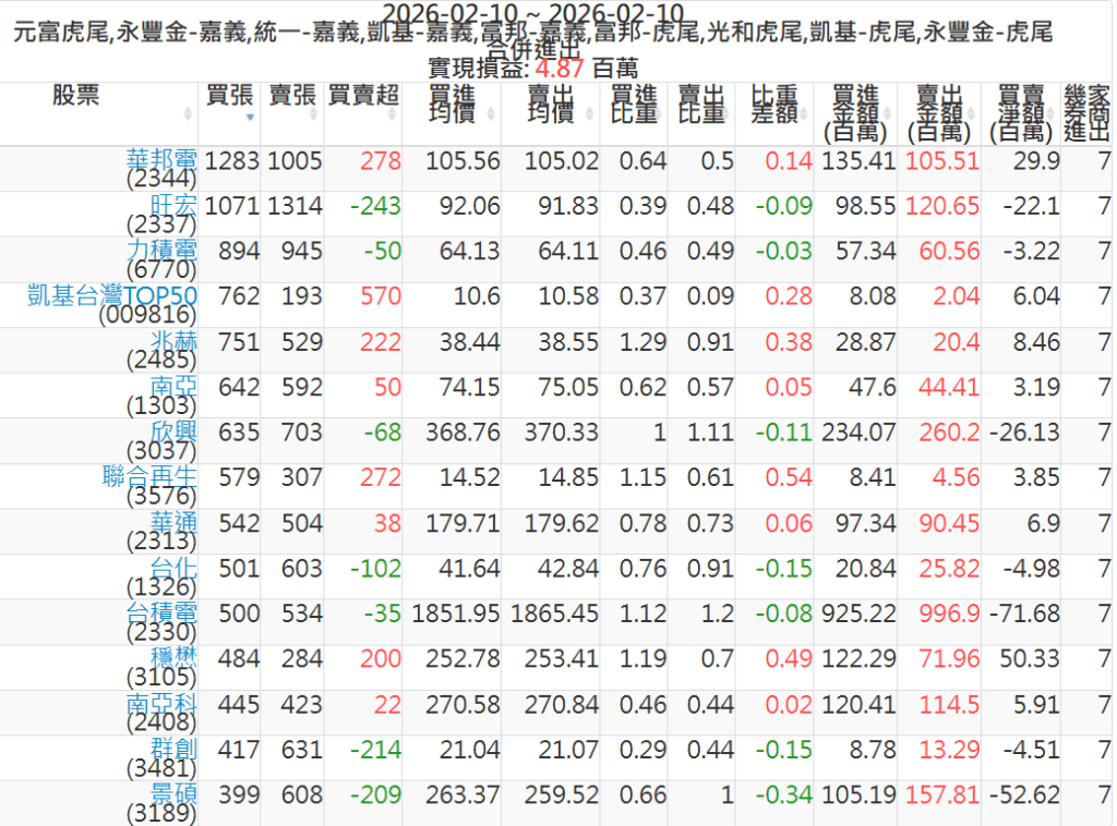 2026-0210主力買賣超個股 2026-02-10 股狗網小編 籌碼面每日資訊 發表留言 可參考下文 『如何查詢當沖、隔日沖分公司券商買賣』 主力當沖券商: 『元富虎尾』,『永豐金嘉義』,『統一嘉義』,『凱基嘉義』,『富邦嘉義』,『富邦虎尾』,『光和虎尾』,『凱基虎尾』,『永豐金虎尾』。 『當沖標的』 『買超股票』 『賣超股票』 免責宣言 本網站文章所提供資訊僅供參考,並無任何推介買賣之意,投資人應自行承擔交易風險。 分享此文: 分享到 X(在新視窗中開啟) X 分享到 Facebook(在新視窗中開啟) Facebook 喜歡 正在載入...