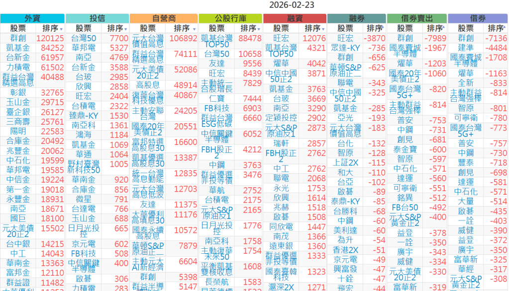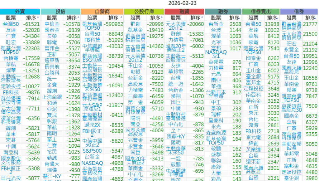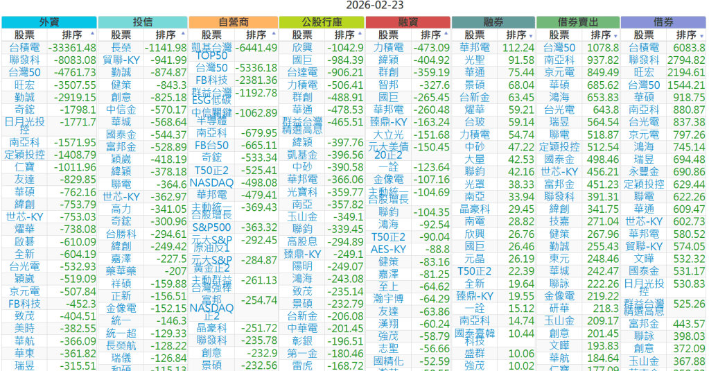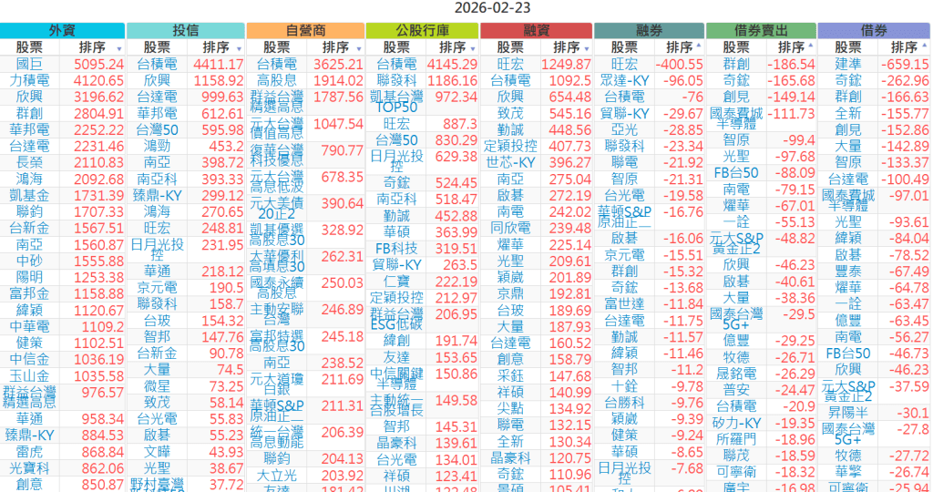 2026-0223【外資、投信】買賣超個股 2026-02-23 股狗網小編 投資誌-大盤 發表留言 上市:【外資、投信】買超(依金額) (單位:百萬) 上市:【外資、投信】賣超(依金額) (單位:百萬) 上市:【外資、投信】買超(依張數) (單位:張數) 上市:【外資、投信】賣超(依張數) (單位:張數) 免責宣言 本網站文章所提供資訊僅供參考,並無任何推介買賣之意,投資人應自行承擔交易風險。 分享此文: 分享到 X(在新視窗中開啟) X 分享到 Facebook(在新視窗中開啟) Facebook 喜歡 正在載入...