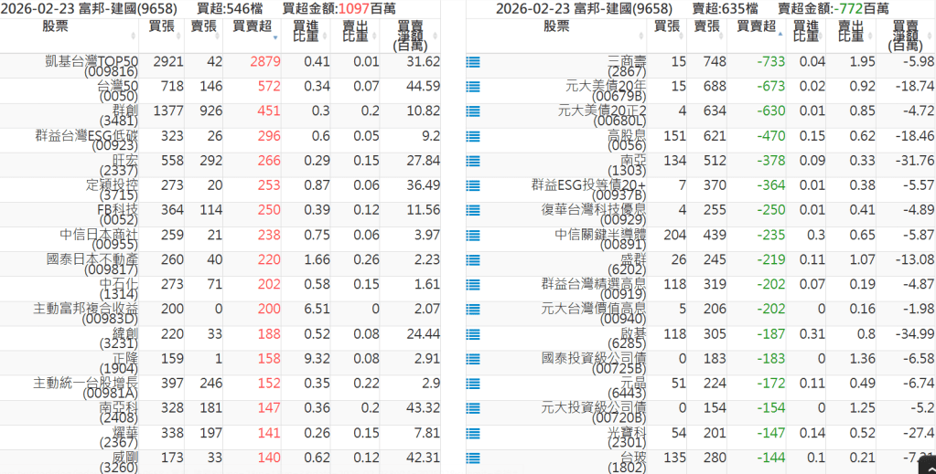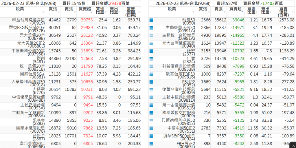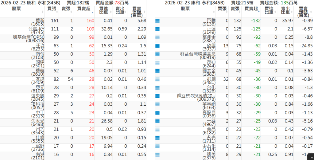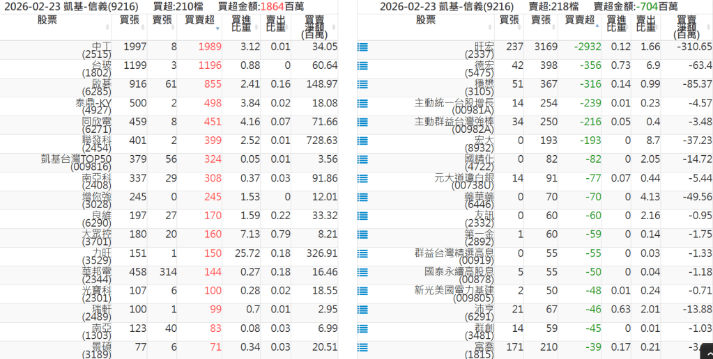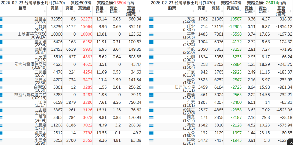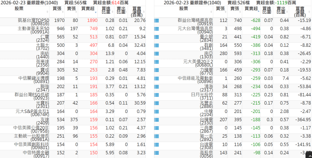 2026-0223關鍵券商買賣超 2026-02-23 股狗網小編 籌碼面每日資訊 發表留言 關鍵券商買賣超: 臺銀證券(1040): 台灣摩根士丹利(1470): 凱基台北(9268): 凱基信義(9216): 元大土城永寧(9875): 康和永和(845B) : 富邦建國(9658): 免責宣言 本網站文章所提供資訊僅供參考,並無任何推介買賣之意,投資人應自行承擔交易風險。 分享此文: 分享到 X(在新視窗中開啟) X 分享到 Facebook(在新視窗中開啟) Facebook 喜歡 正在載入...