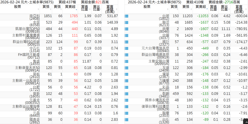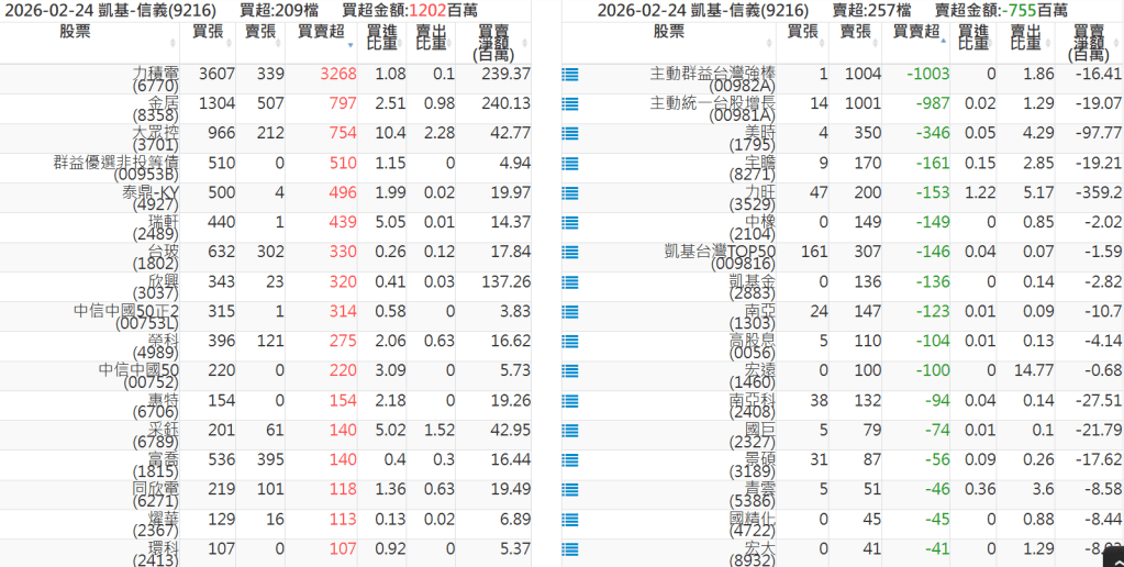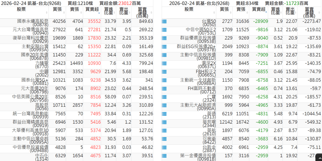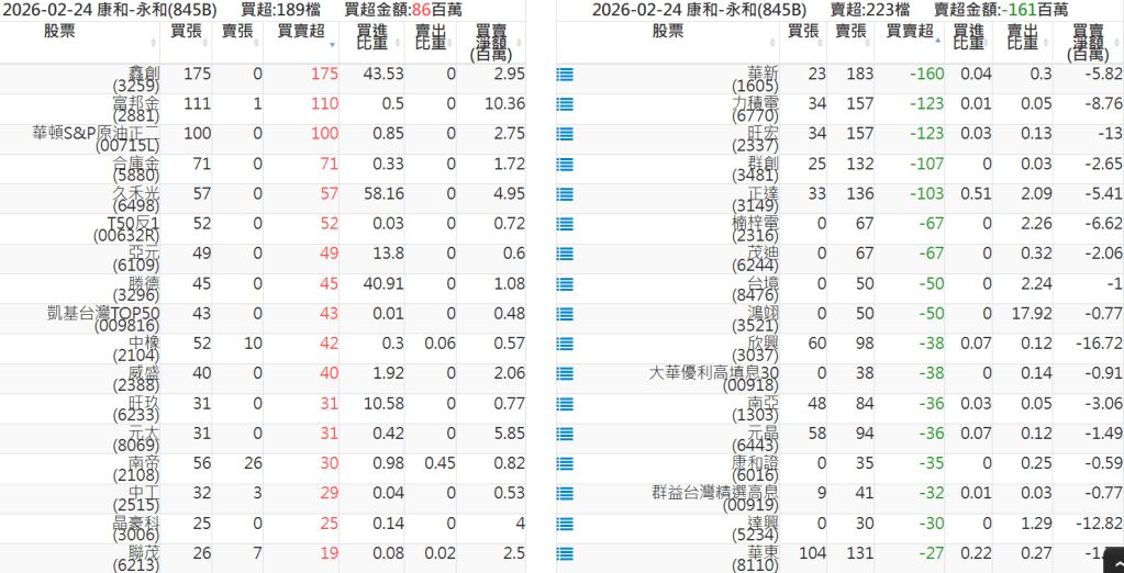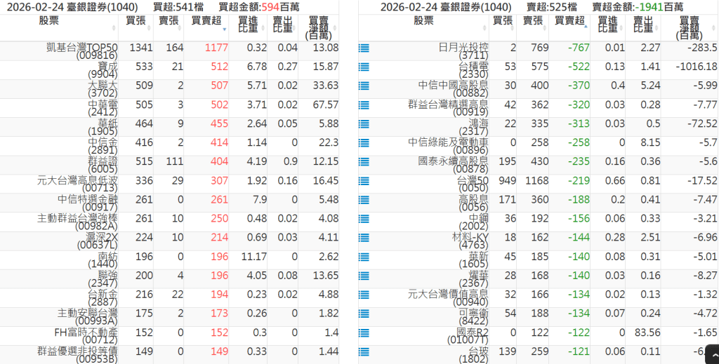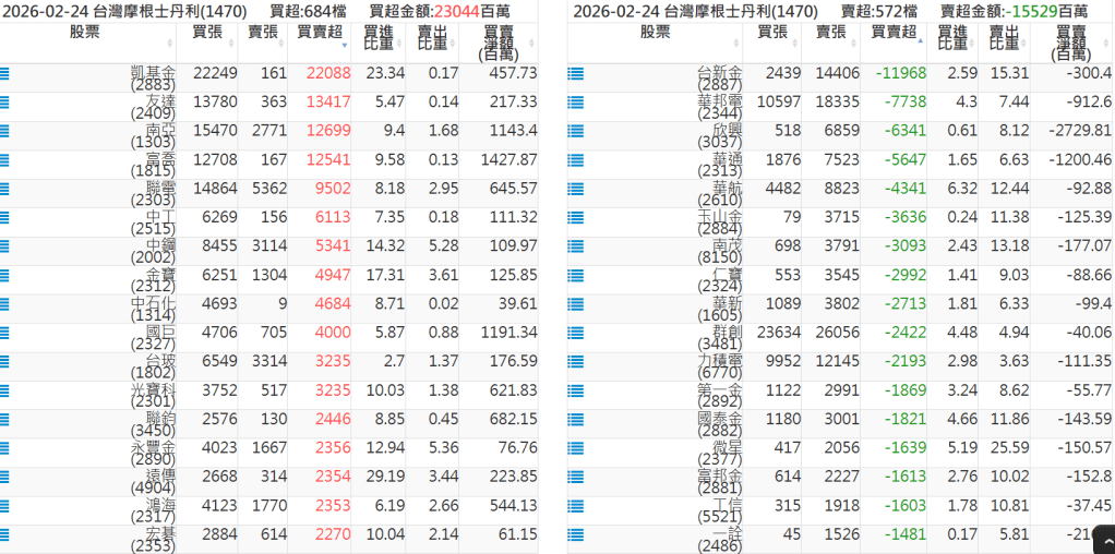 2026-0224關鍵券商買賣超 2026-02-24 股狗網小編 籌碼面每日資訊 發表留言 關鍵券商買賣超: 臺銀證券(1040): 台灣摩根士丹利(1470): 凱基台北(9268): 凱基信義(9216): 元大土城永寧(9875): 康和永和(845B) : 富邦建國(9658): 免責宣言 本網站文章所提供資訊僅供參考,並無任何推介買賣之意,投資人應自行承擔交易風險。 分享此文: 分享到 X(在新視窗中開啟) X 分享到 Facebook(在新視窗中開啟) Facebook 喜歡 正在載入...