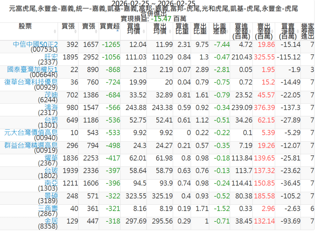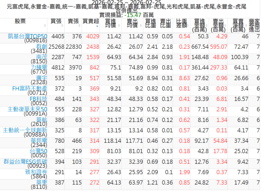2026-0225主力買賣超個股 2026-02-25 股狗網小編 籌碼面每日資訊 發表留言 可參考下文 『如何查詢當沖、隔日沖分公司券商買賣』 主力當沖券商: 『元富虎尾』,『永豐金嘉義』,『統一嘉義』,『凱基嘉義』,『富邦嘉義』,『富邦虎尾』,『光和虎尾』,『凱基虎尾』,『永豐金虎尾』。 『當沖標的』 『買超股票』 『賣超股票』 免責宣言 本網站文章所提供資訊僅供參考,並無任何推介買賣之意,投資人應自行承擔交易風險。 分享此文: 分享到 X(在新視窗中開啟) X 分享到 Facebook(在新視窗中開啟) Facebook 喜歡 正在載入...