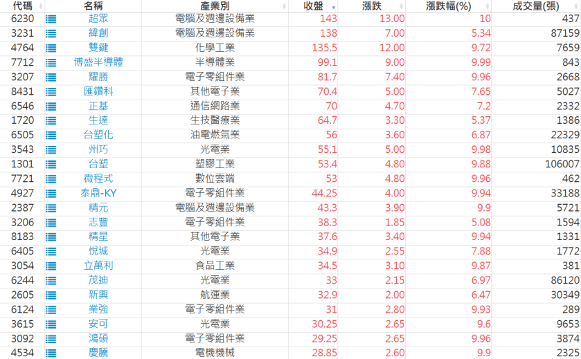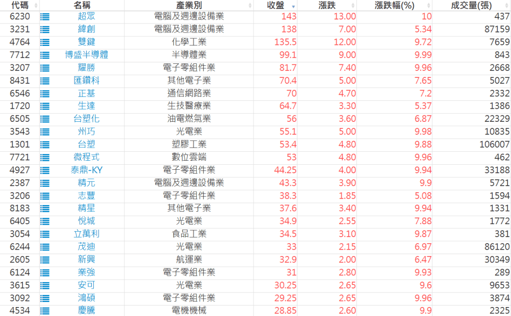 2026-0225日新高爆量上漲股 2026-02-25 股狗網小編 選股條件 發表留言 利用股狗選股的選股條件可以【挑選突破20日新高,爆量上漲起漲點股票】 1.股狗選股 https://www.stockdog.com.tw 2.選股條件: a.收盤價創20日新高 b.當日漲幅 > 2% C.成交量大於5日均量2倍 免責宣言 本網站文章所提供資訊僅供參考,並無任何推介買賣之意,投資人應自行承擔交易風險。 分享此文: 分享到 X(在新視窗中開啟) X 分享到 Facebook(在新視窗中開啟) Facebook 喜歡 正在載入...