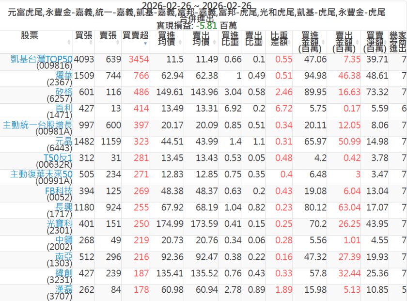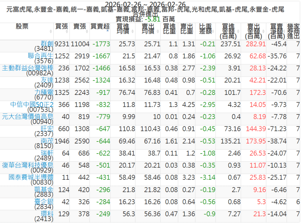 2026-0226主力買賣超個股 2026-02-26 股狗網小編 籌碼面每日資訊 發表留言 可參考下文 『如何查詢當沖、隔日沖分公司券商買賣』 主力當沖券商: 『元富虎尾』,『永豐金嘉義』,『統一嘉義』,『凱基嘉義』,『富邦嘉義』,『富邦虎尾』,『光和虎尾』,『凱基虎尾』,『永豐金虎尾』。 『當沖標的』 『買超股票』 『賣超股票』 免責宣言 本網站文章所提供資訊僅供參考,並無任何推介買賣之意,投資人應自行承擔交易風險。 分享此文: 分享到 X(在新視窗中開啟) X 分享到 Facebook(在新視窗中開啟) Facebook 喜歡 正在載入...