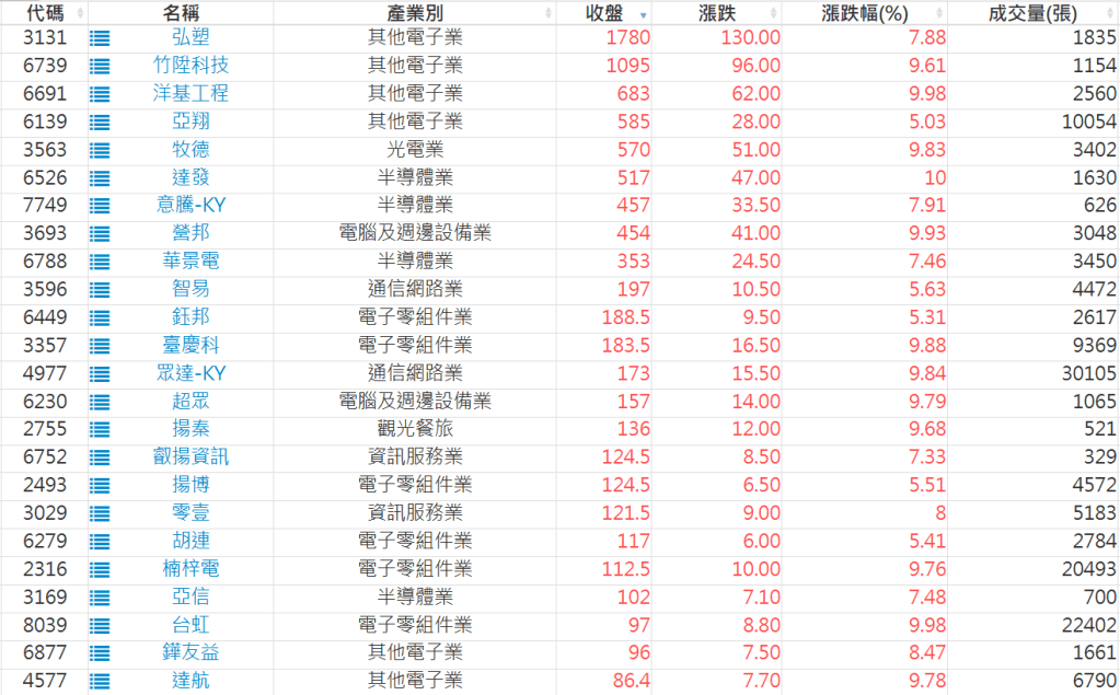 2026-0226日新高爆量上漲股 2026-02-26 股狗網小編 選股條件 發表留言 利用股狗選股的選股條件可以【挑選突破20日新高,爆量上漲起漲點股票】 1.股狗選股 https://www.stockdog.com.tw 2.選股條件: a.收盤價創20日新高 b.當日漲幅 > 2% C.成交量大於5日均量2倍 免責宣言 本網站文章所提供資訊僅供參考,並無任何推介買賣之意,投資人應自行承擔交易風險。 分享此文: 分享到 X(在新視窗中開啟) X 分享到 Facebook(在新視窗中開啟) Facebook 喜歡 正在載入...