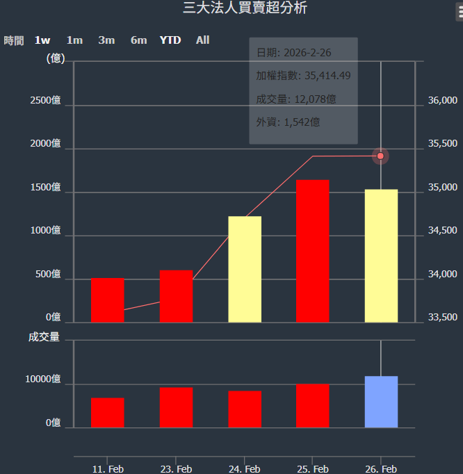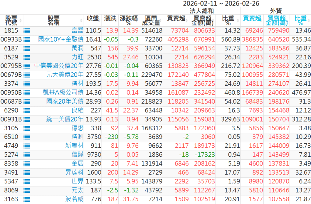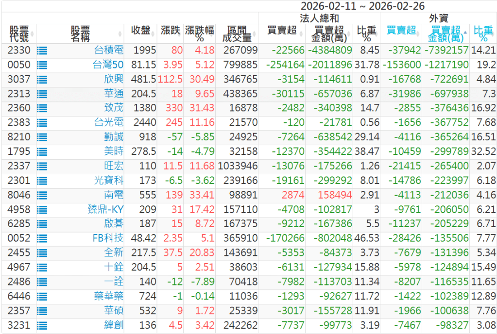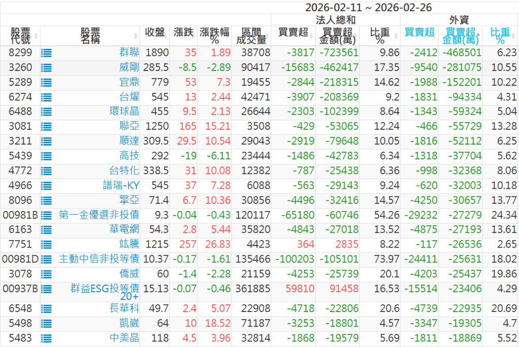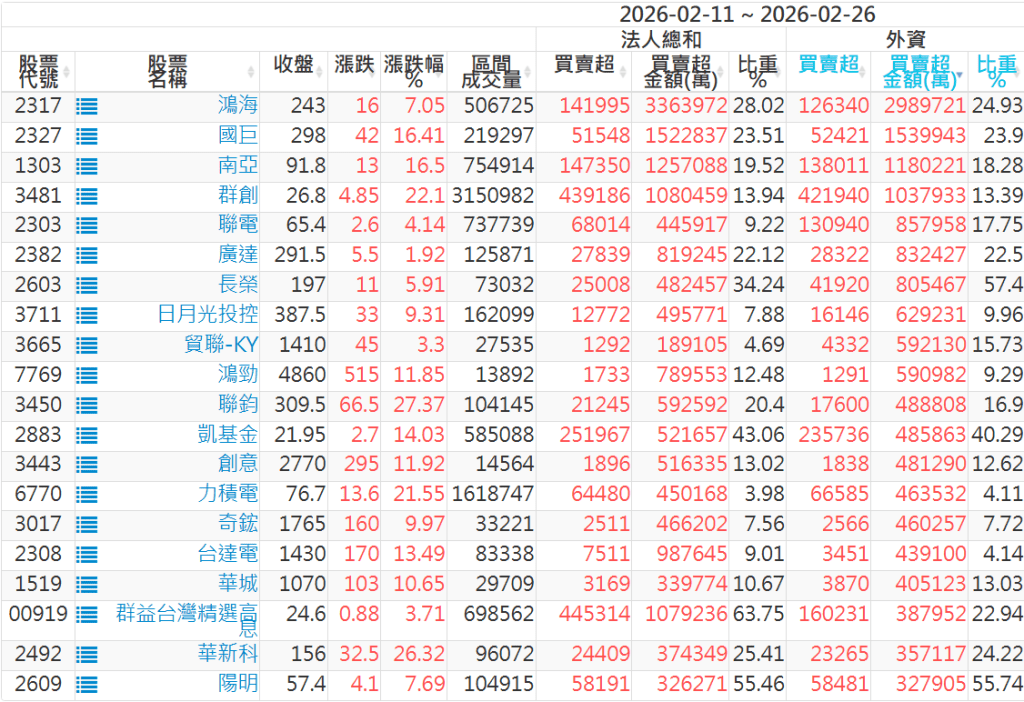 2026/02/11~2026/02/26近5日【外資】買賣超個股 2026-03-01 股狗網小編 投資誌-大盤 發表留言 外資本周累積【買超】約1542億元。 【上市外資買超個股】(以金額排行,單位:萬) 【上市外資賣超個股】(以金額排行,單位:萬) 【上櫃外資買超個股】(以金額排行,單位:萬) 【上櫃外資賣超個股】(以金額排行,單位:萬) 免責宣言 本網站文章所提供資訊僅供參考,並無任何推介買賣之意,投資人應自行承擔交易風險。 分享此文: 分享到 X(在新視窗中開啟) X 分享到 Facebook(在新視窗中開啟) Facebook 喜歡 正在載入...