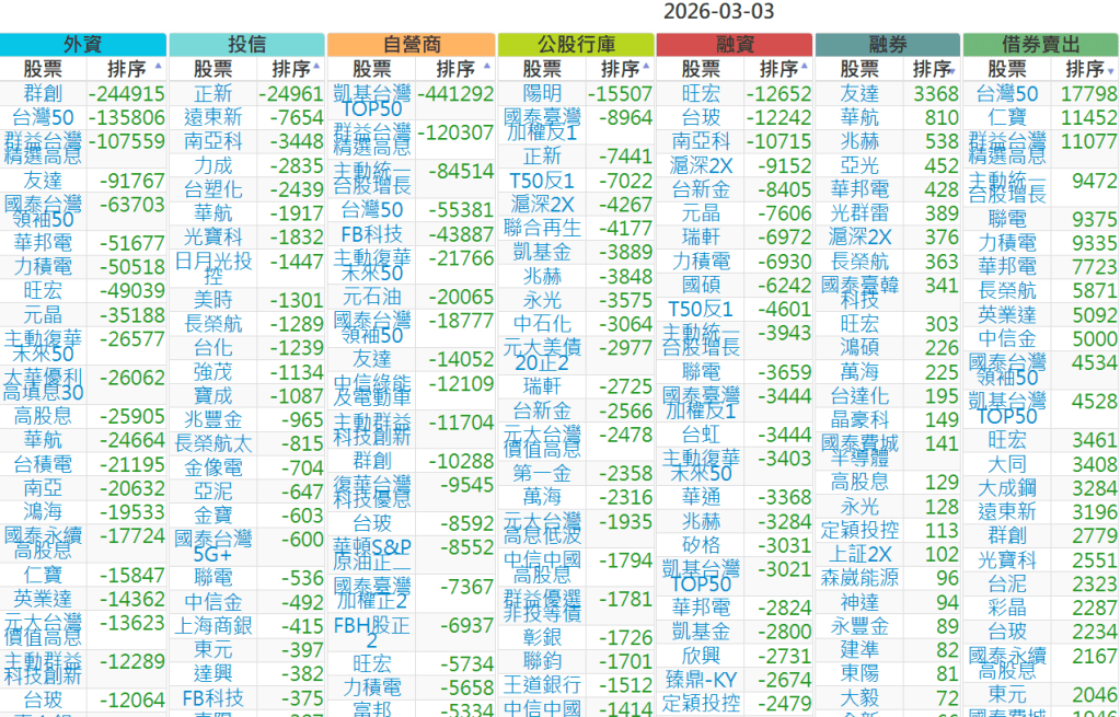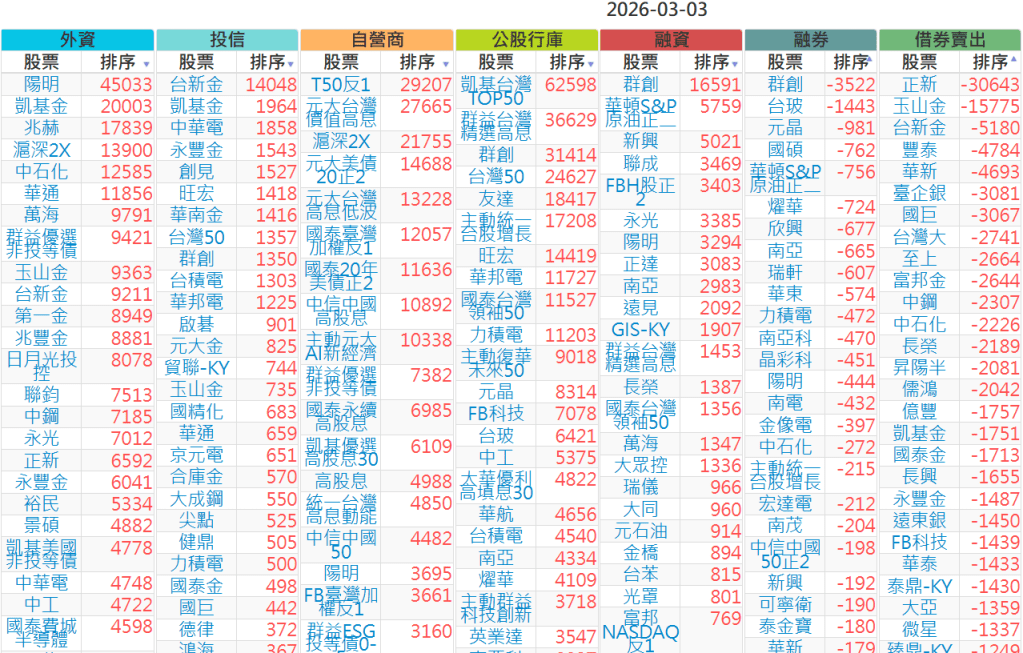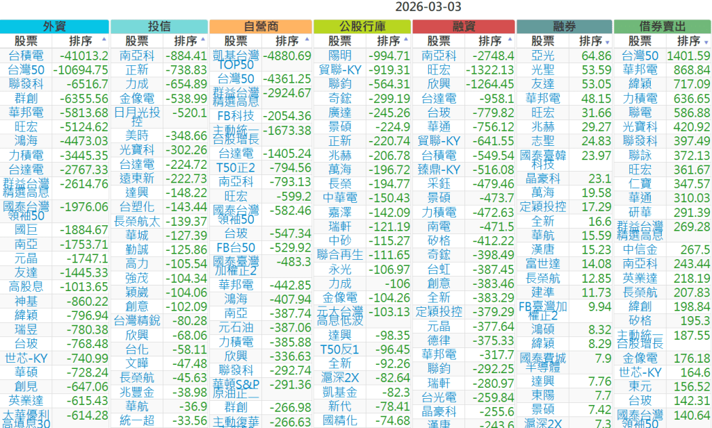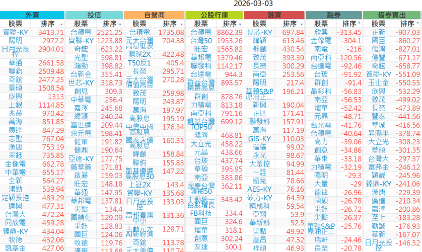 2026-0303【外資、投信】買賣超個股 2026-03-04 股狗網小編 投資誌-大盤 發表留言 上市:【外資、投信】買超(依金額) (單位:百萬) 上市:【外資、投信】賣超(依金額) (單位:百萬) 上市:【外資、投信】買超(依張數) (單位:張數) 上市:【外資、投信】賣超(依張數) (單位:張數) 免責宣言 本網站文章所提供資訊僅供參考,並無任何推介買賣之意,投資人應自行承擔交易風險。 分享此文: 分享到 X(在新視窗中開啟) X 分享到 Facebook(在新視窗中開啟) Facebook 喜歡 正在載入...