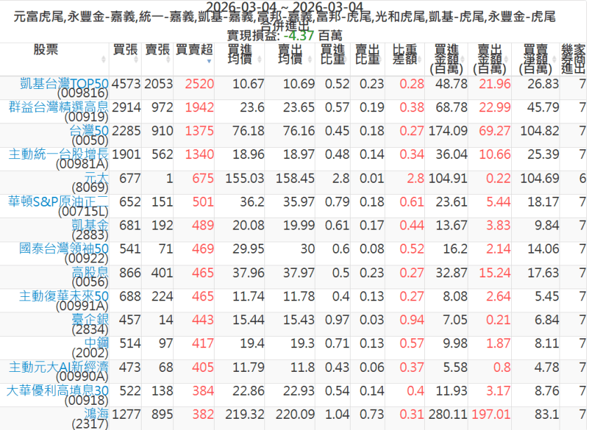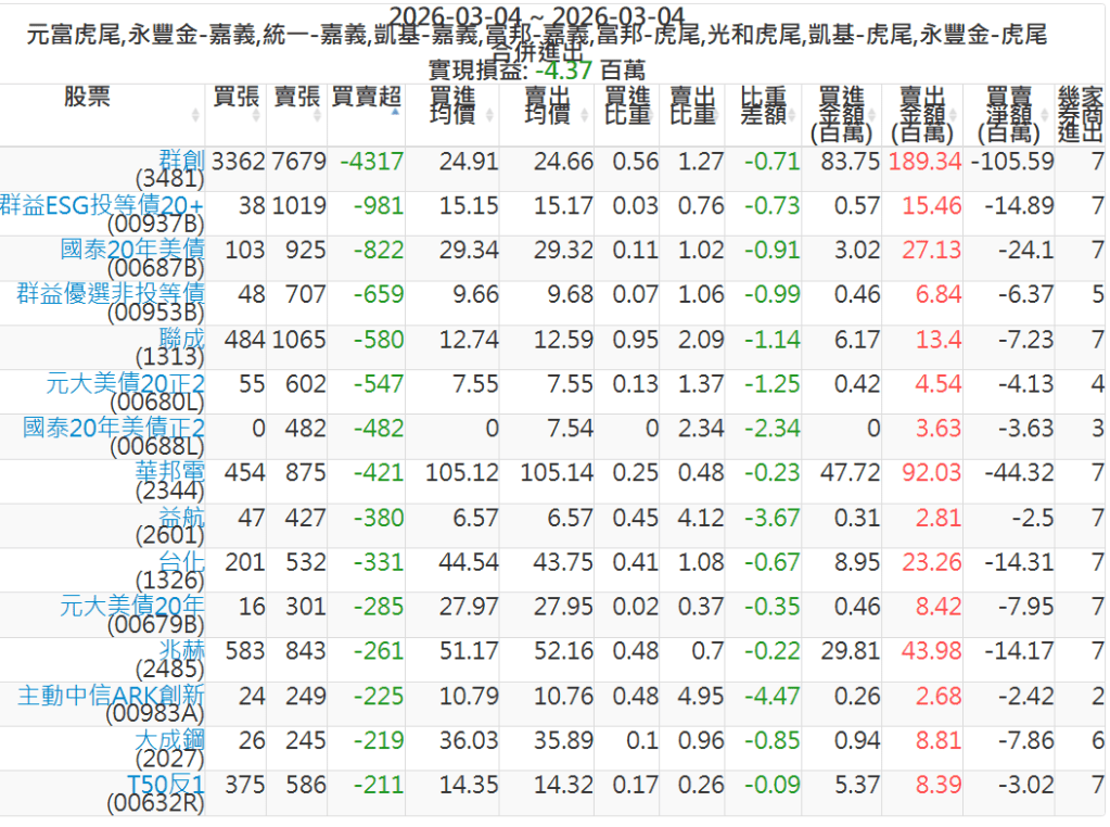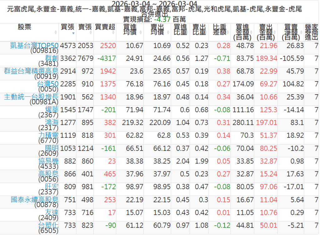 2026-0304主力買賣超個股 2026-03-04 股狗網小編 籌碼面每日資訊 發表留言 可參考下文 『如何查詢當沖、隔日沖分公司券商買賣』 主力當沖券商: 『元富虎尾』,『永豐金嘉義』,『統一嘉義』,『凱基嘉義』,『富邦嘉義』,『富邦虎尾』,『光和虎尾』,『凱基虎尾』,『永豐金虎尾』。 『當沖標的』 『買超股票』 『賣超股票』 免責宣言 本網站文章所提供資訊僅供參考,並無任何推介買賣之意,投資人應自行承擔交易風險。 分享此文: 分享到 X(在新視窗中開啟) X 分享到 Facebook(在新視窗中開啟) Facebook 喜歡 正在載入...