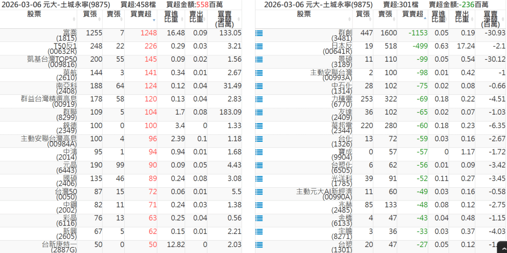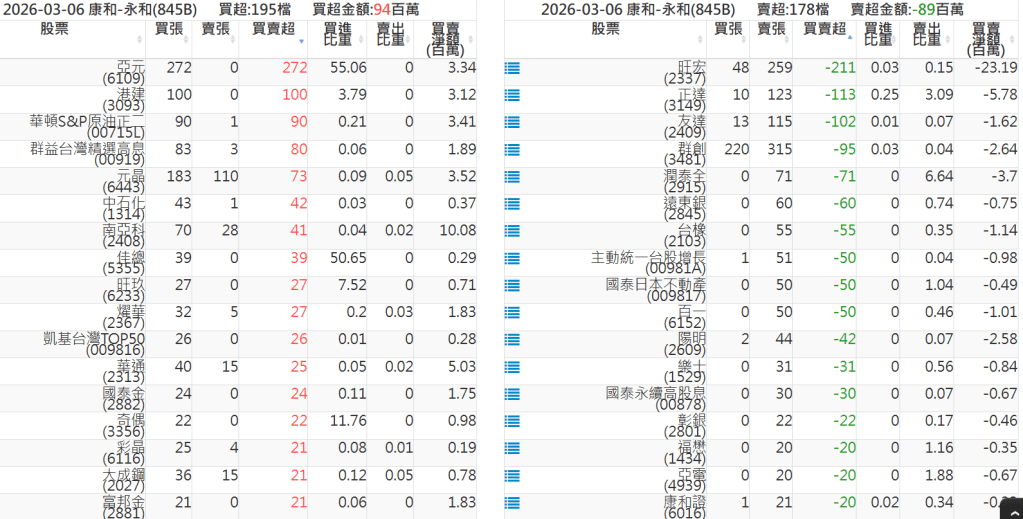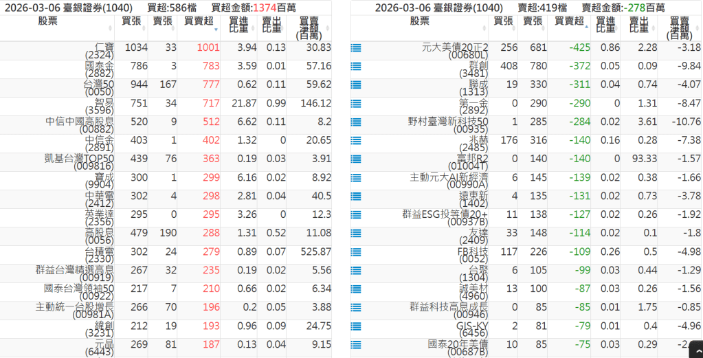 2026-0306關鍵券商買賣超 2026-03-07 股狗網小編 籌碼面每日資訊 發表留言 關鍵券商買賣超: 臺銀證券(1040): 台灣摩根士丹利(1470): 凱基台北(9268): 凱基信義(9216): 元大土城永寧(9875): 康和永和(845B) : 富邦建國(9658): 免責宣言 本網站文章所提供資訊僅供參考,並無任何推介買賣之意,投資人應自行承擔交易風險。 分享此文: 分享到 X(在新視窗中開啟) X 分享到 Facebook(在新視窗中開啟) Facebook 喜歡 正在載入...