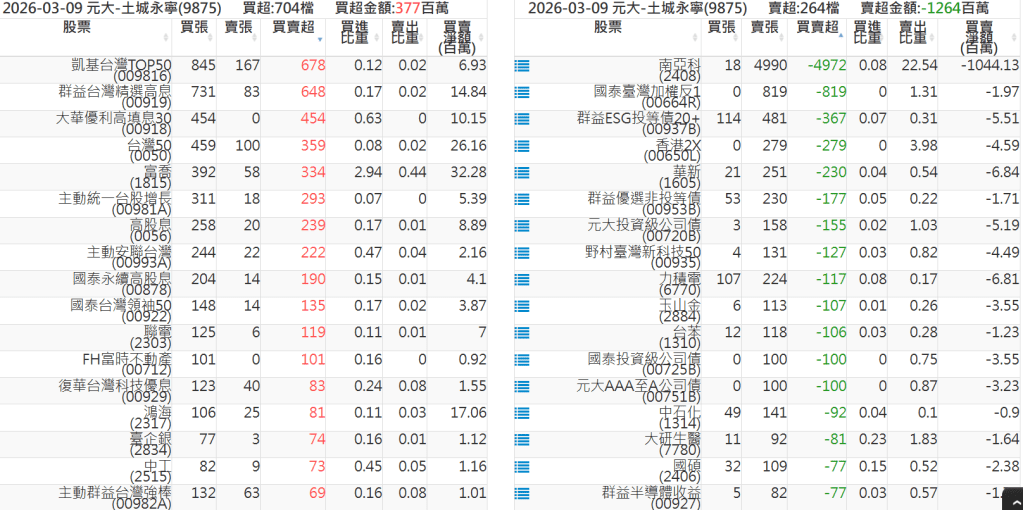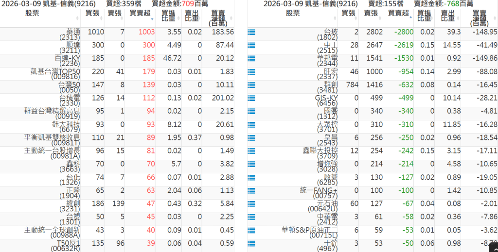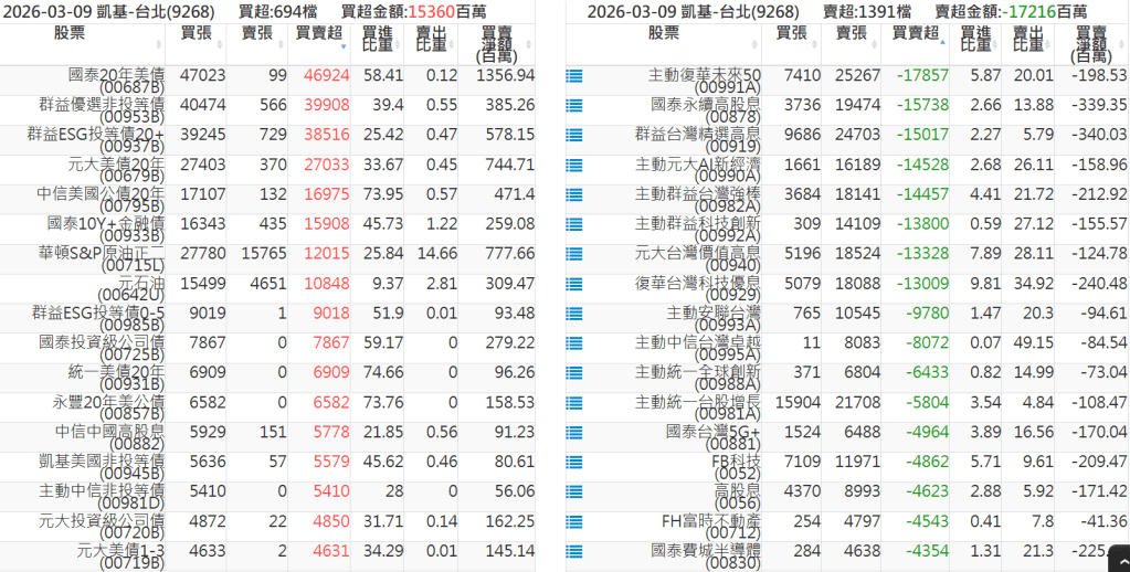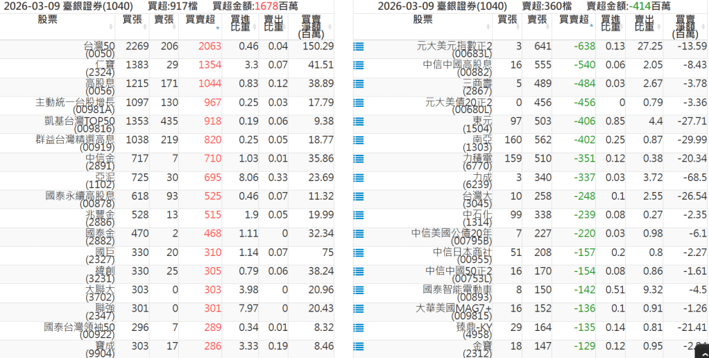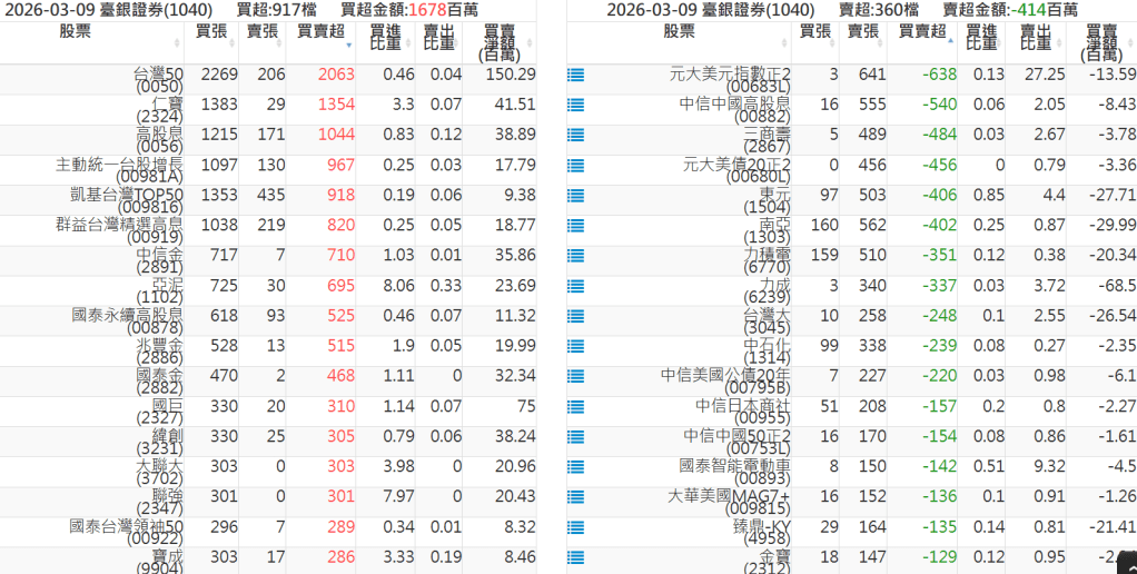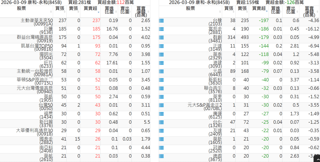 2026-0309關鍵券商買賣超 2026-03-09 股狗網小編 籌碼面每日資訊 發表留言 關鍵券商買賣超: 臺銀證券(1040): 台灣摩根士丹利(1470): 凱基台北(9268): 凱基信義(9216): 元大土城永寧(9875): 康和永和(845B) : 富邦建國(9658): 免責宣言 本網站文章所提供資訊僅供參考,並無任何推介買賣之意,投資人應自行承擔交易風險。 分享此文: 分享到 X(在新視窗中開啟) X 分享到 Facebook(在新視窗中開啟) Facebook 喜歡 正在載入...