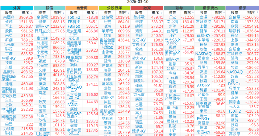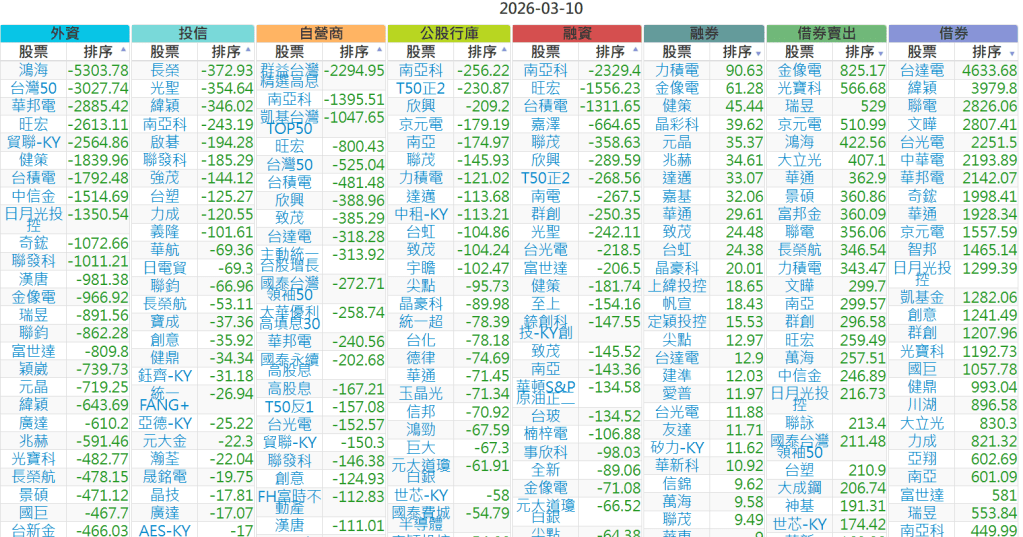 2026-0310【外資、投信】買賣超個股 2026-03-10 股狗網小編 投資誌-大盤 發表留言 上市:【外資、投信】買超(依金額) (單位:百萬) 上市:【外資、投信】賣超(依金額) (單位:百萬) 上市:【外資、投信】買超(依張數) (單位:張數) 上市:【外資、投信】賣超(依張數) (單位:張數) 免責宣言 本網站文章所提供資訊僅供參考,並無任何推介買賣之意,投資人應自行承擔交易風險。 分享此文: 分享到 X(在新視窗中開啟) X 分享到 Facebook(在新視窗中開啟) Facebook 喜歡 正在載入...