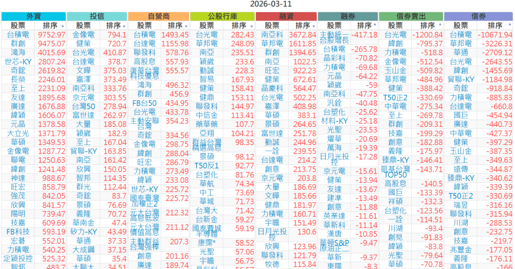 2026-0311【外資、投信】買賣超個股 2026-03-11 股狗網小編 投資誌-大盤 發表留言 上市:【外資、投信】買超(依金額) (單位:百萬) 上市:【外資、投信】賣超(依金額) (單位:百萬) 上市:【外資、投信】買超(依張數) (單位:張數) 上市:【外資、投信】賣超(依張數) (單位:張數) 免責宣言 本網站文章所提供資訊僅供參考,並無任何推介買賣之意,投資人應自行承擔交易風險。 分享此文: 分享到 X(在新視窗中開啟) X 分享到 Facebook(在新視窗中開啟) Facebook 喜歡 正在載入...