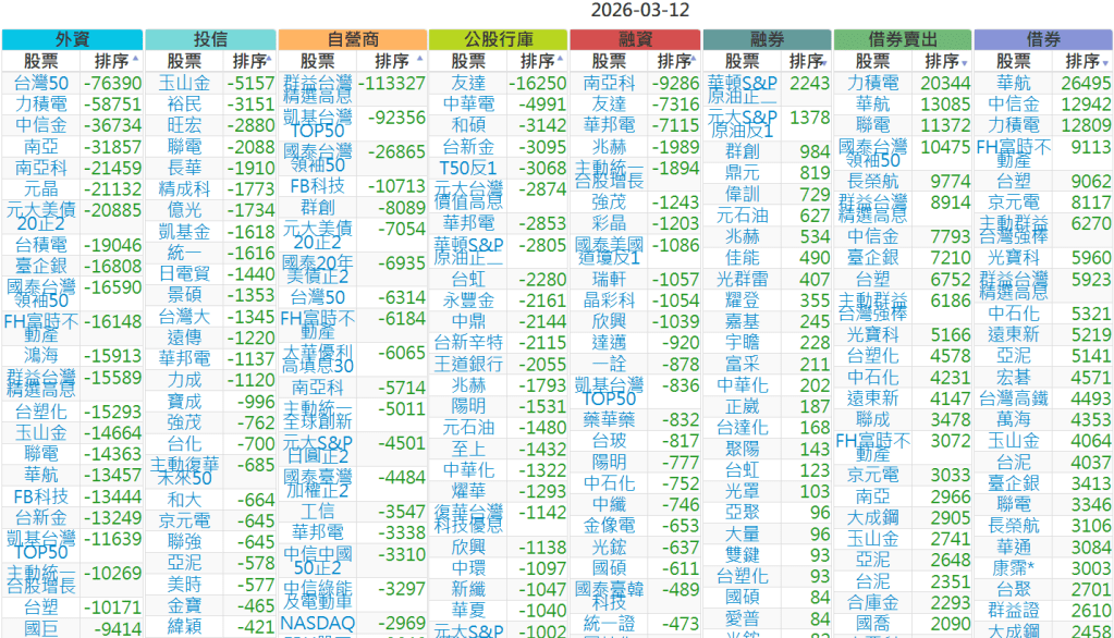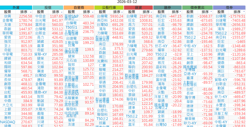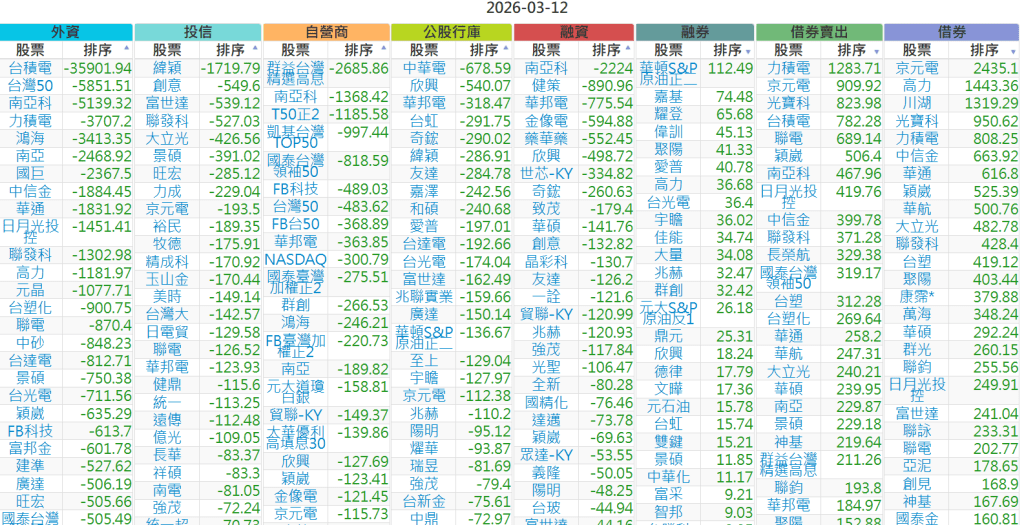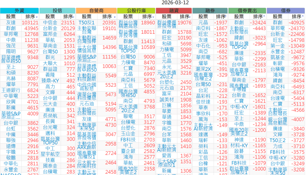 2026-0312【外資、投信】買賣超個股 2026-03-12 股狗網小編 投資誌-大盤 發表留言 上市:【外資、投信】買超(依金額) (單位:百萬) 上市:【外資、投信】賣超(依金額) (單位:百萬) 上市:【外資、投信】買超(依張數) (單位:張數) 上市:【外資、投信】賣超(依張數) (單位:張數) 免責宣言 本網站文章所提供資訊僅供參考,並無任何推介買賣之意,投資人應自行承擔交易風險。 分享此文: 分享到 X(在新視窗中開啟) X 分享到 Facebook(在新視窗中開啟) Facebook 喜歡 正在載入...