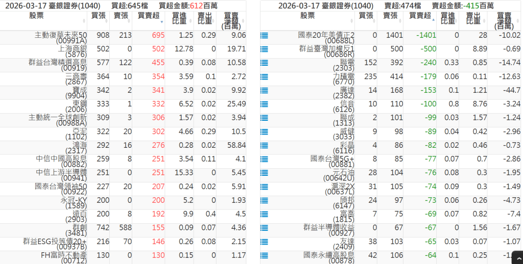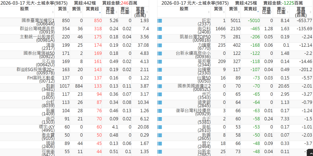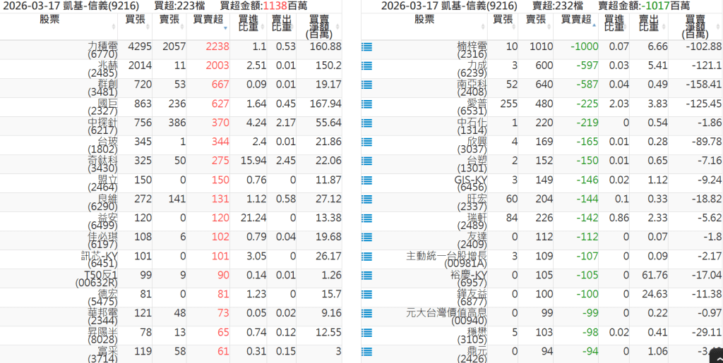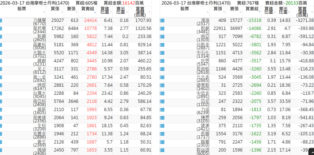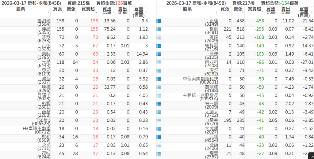 2026-0317關鍵券商買賣超 2026-03-17 股狗網小編 籌碼面每日資訊 發表留言 關鍵券商買賣超: 臺銀證券(1040): 台灣摩根士丹利(1470): 凱基台北(9268): 凱基信義(9216): 元大土城永寧(9875): 康和永和(845B) : 富邦建國(9658): 免責宣言 本網站文章所提供資訊僅供參考,並無任何推介買賣之意,投資人應自行承擔交易風險。 分享此文: 分享到 X(在新視窗中開啟) X 分享到 Facebook(在新視窗中開啟) Facebook 喜歡 正在載入...