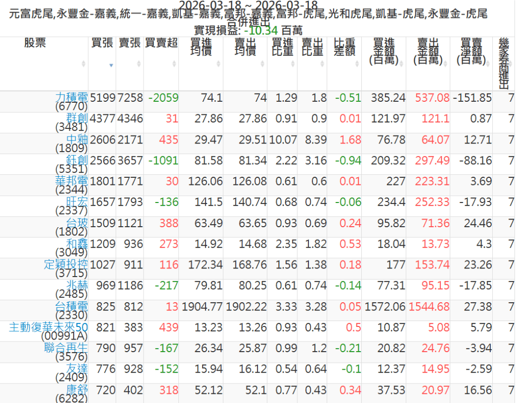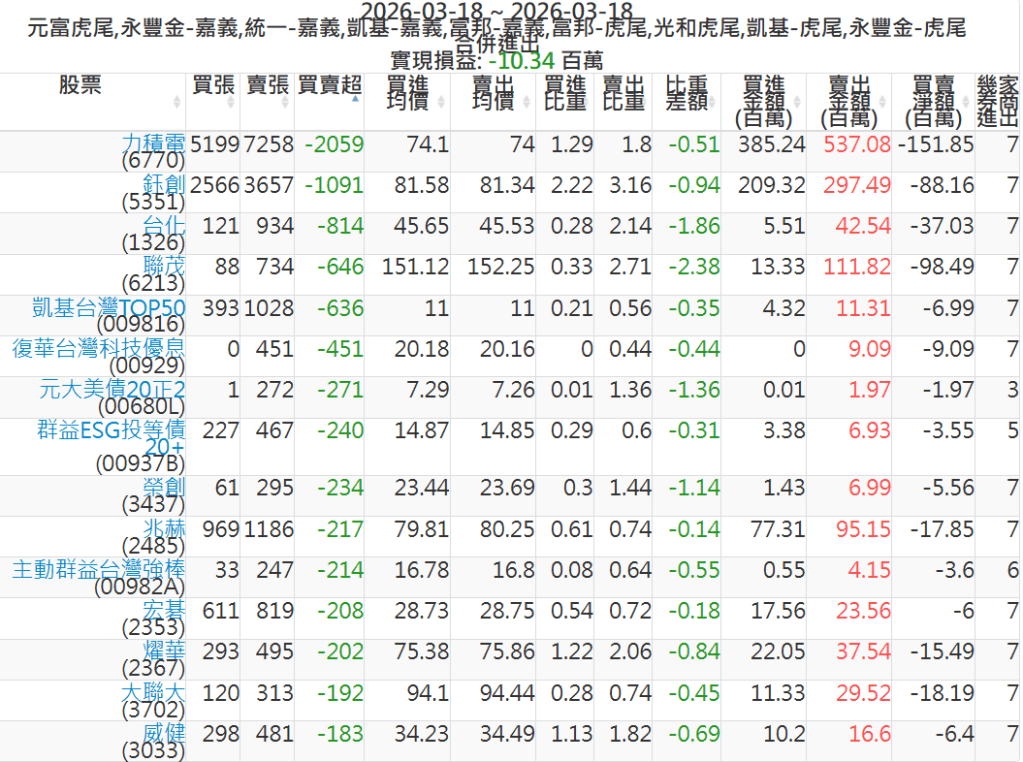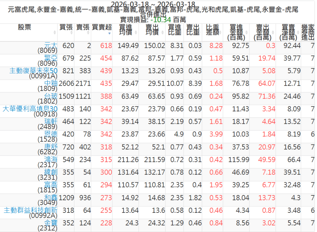 2026-0318主力買賣超個股 2026-03-18 股狗網小編 籌碼面每日資訊 發表留言 可參考下文 『如何查詢當沖、隔日沖分公司券商買賣』 主力當沖券商: 『元富虎尾』,『永豐金嘉義』,『統一嘉義』,『凱基嘉義』,『富邦嘉義』,『富邦虎尾』,『光和虎尾』,『凱基虎尾』,『永豐金虎尾』。 『當沖標的』 『買超股票』 『賣超股票』 免責宣言 本網站文章所提供資訊僅供參考,並無任何推介買賣之意,投資人應自行承擔交易風險。 分享此文: 分享到 X(在新視窗中開啟) X 分享到 Facebook(在新視窗中開啟) Facebook 喜歡 正在載入...