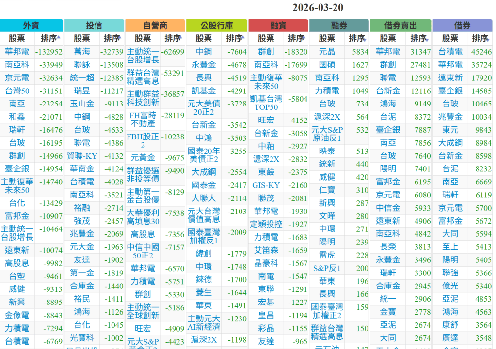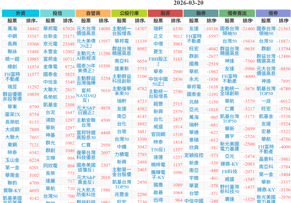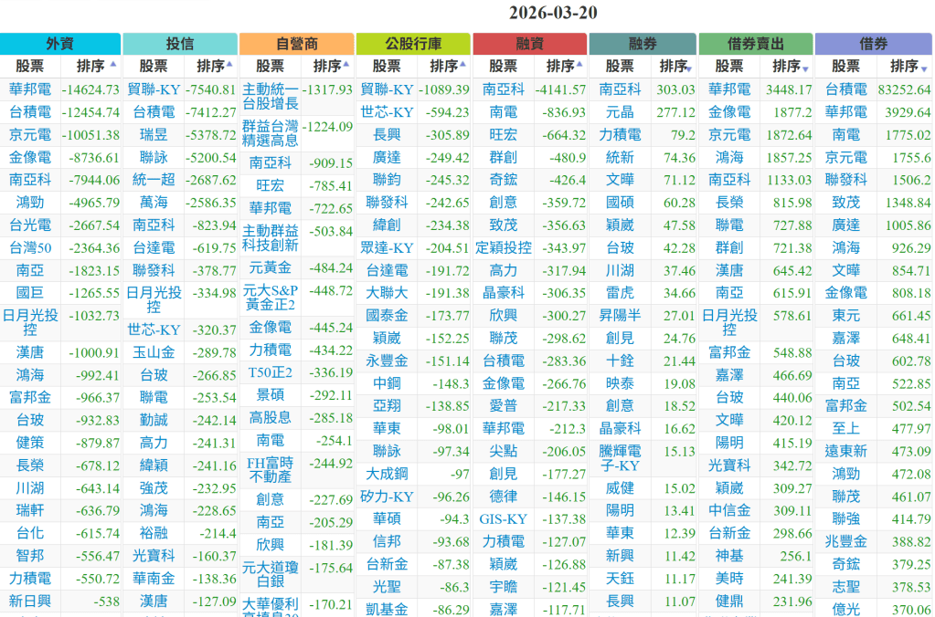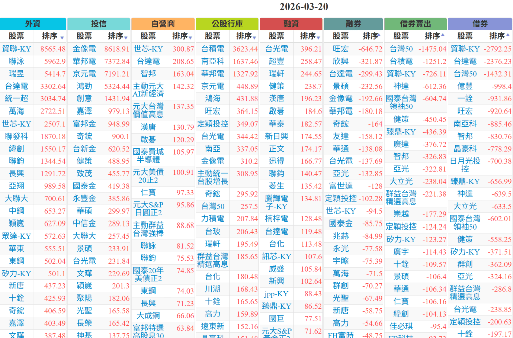 2026-0320【外資、投信】買賣超個股 2026-03-21 股狗網小編 投資誌-大盤 發表留言 上市:【外資、投信】買超(依金額) (單位:百萬) 上市:【外資、投信】賣超(依金額) (單位:百萬) 上市:【外資、投信】買超(依張數) (單位:張數) 上市:【外資、投信】賣超(依張數) (單位:張數) 免責宣言 本網站文章所提供資訊僅供參考,並無任何推介買賣之意,投資人應自行承擔交易風險。 分享此文: 分享到 X(在新視窗中開啟) X 分享到 Facebook(在新視窗中開啟) Facebook 喜歡 正在載入...