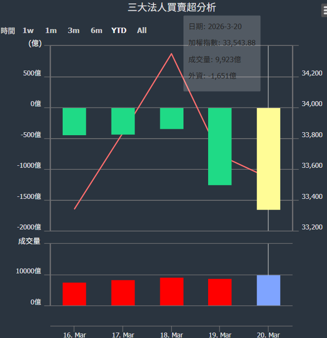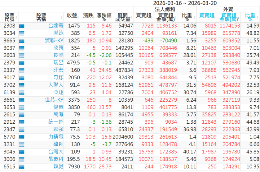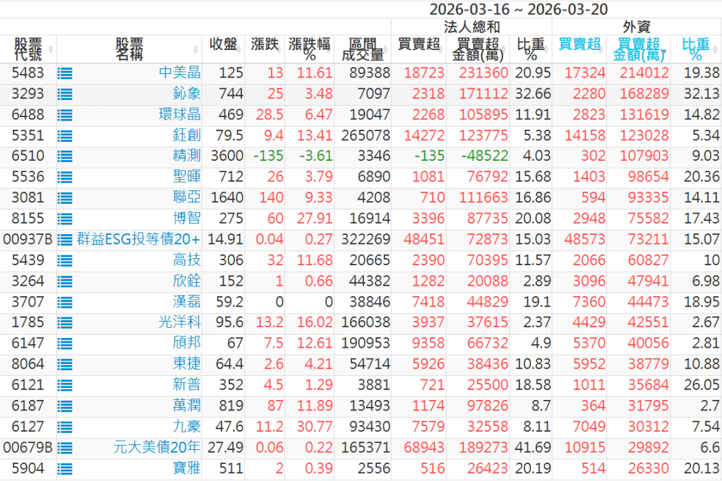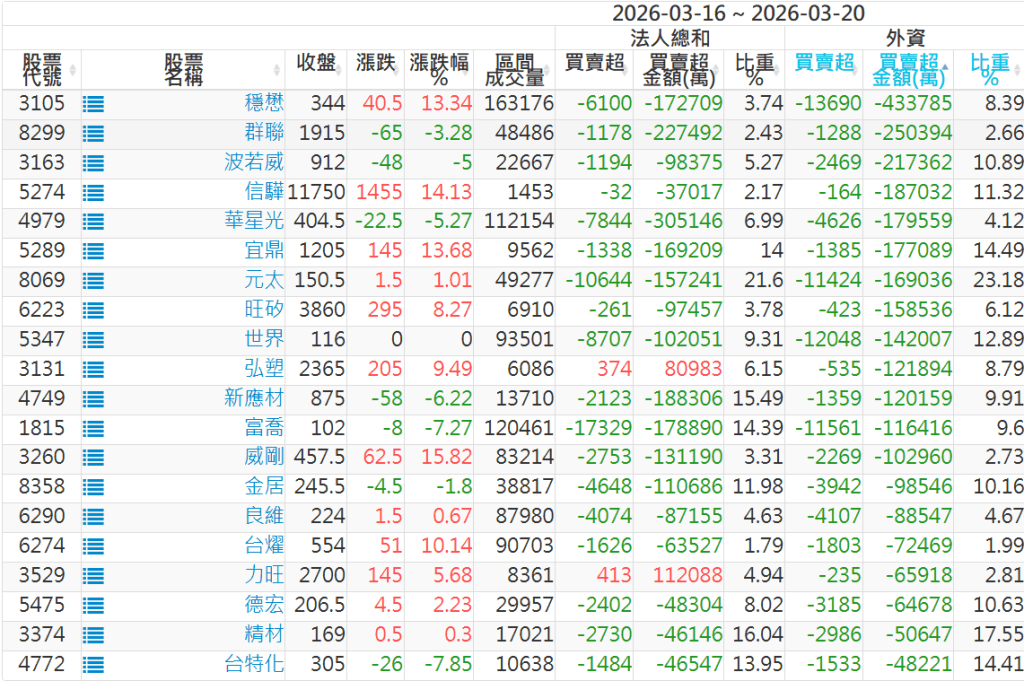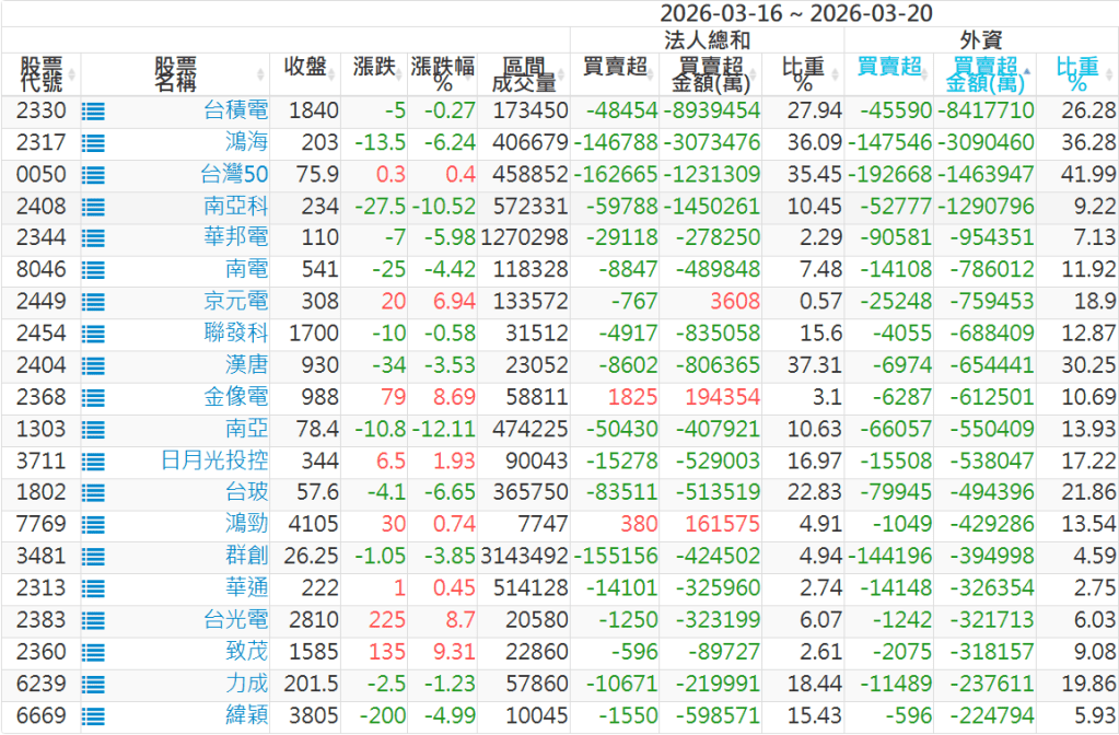 2026/03/16~2026/03/20近5日【外資】買賣超個股 2026-03-22 股狗網小編 投資誌-大盤 發表留言 外資本周累積【賣超】約1651億元。 【上市外資買超個股】(以金額排行,單位:萬) 【上市外資賣超個股】(以金額排行,單位:萬) 【上櫃外資買超個股】(以金額排行,單位:萬) 【上櫃外資賣超個股】(以金額排行,單位:萬) 免責宣言 本網站文章所提供資訊僅供參考,並無任何推介買賣之意,投資人應自行承擔交易風險。 分享此文: 分享到 X(在新視窗中開啟) X 分享到 Facebook(在新視窗中開啟) Facebook 喜歡 正在載入...