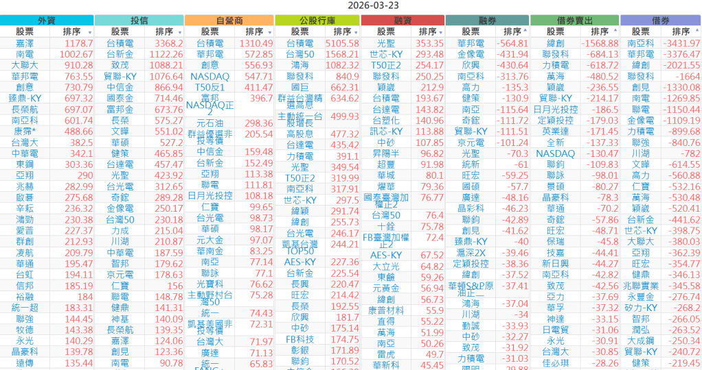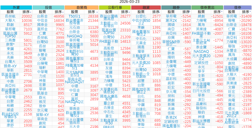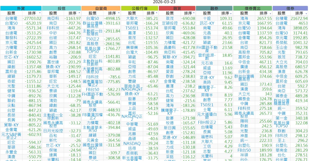 2026-0323【外資、投信】買賣超個股 2026-03-23 股狗網小編 投資誌-大盤 發表留言 上市:【外資、投信】買超(依金額) (單位:百萬) 上市:【外資、投信】賣超(依金額) (單位:百萬) 上市:【外資、投信】買超(依張數) (單位:張數) 上市:【外資、投信】賣超(依張數) (單位:張數) 免責宣言 本網站文章所提供資訊僅供參考,並無任何推介買賣之意,投資人應自行承擔交易風險。 分享此文: 分享到 X(在新視窗中開啟) X 分享到 Facebook(在新視窗中開啟) Facebook 喜歡 正在載入...